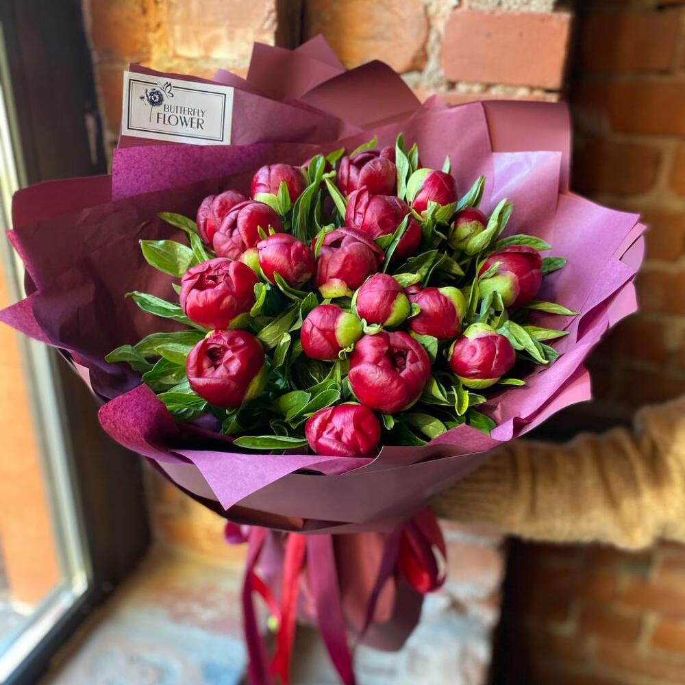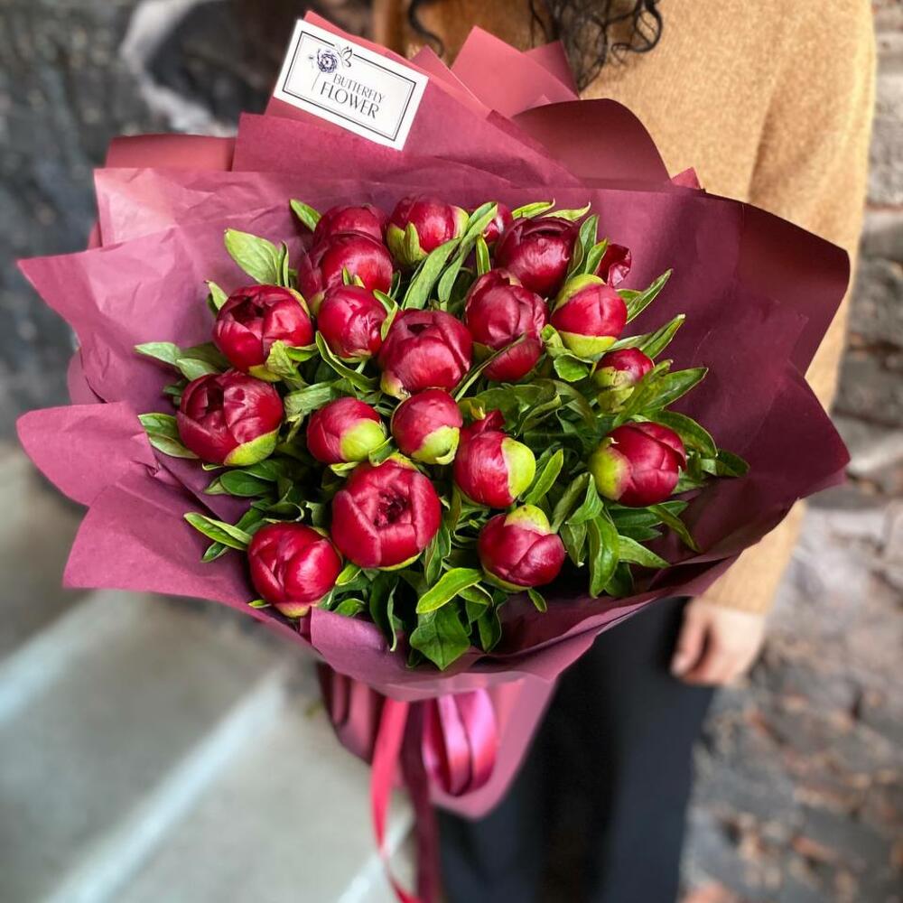 Букет из 17 бордовых пионов в дизайнерской упаковке “Ванда Вижн”