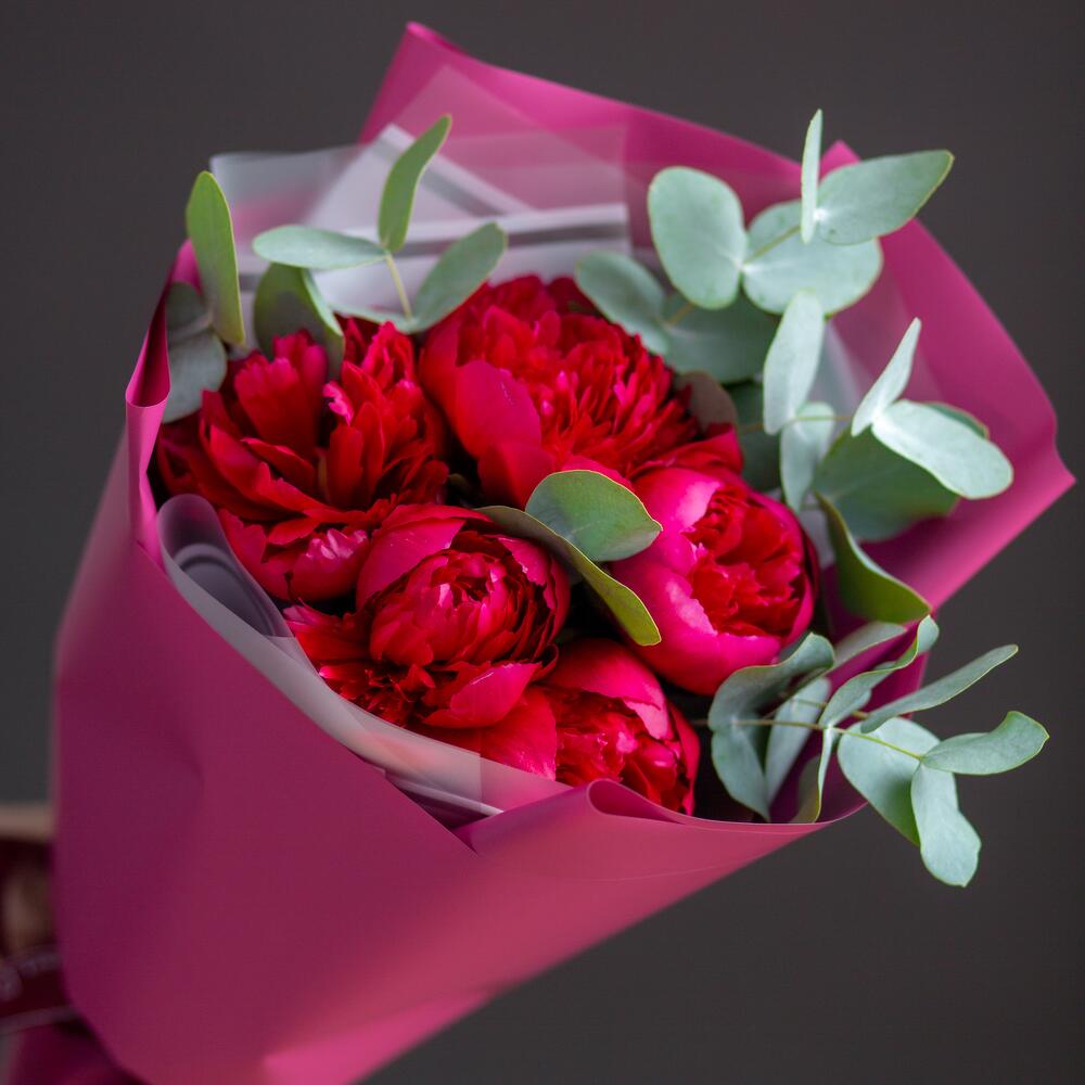 Букет из 17 бордовых пионов в дизайнерской упаковке "Ванда Вижн"