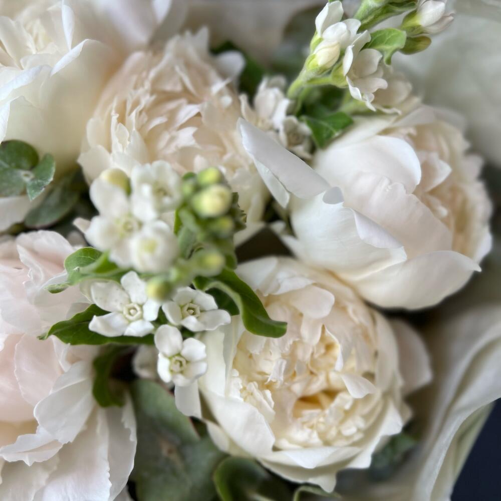 Пион – 5 шт.Оксипеталум – 3 шт.Эвкалипт – 3 шт.декоративная упаковка – 1 шт.Атласная лента – 1 шт.