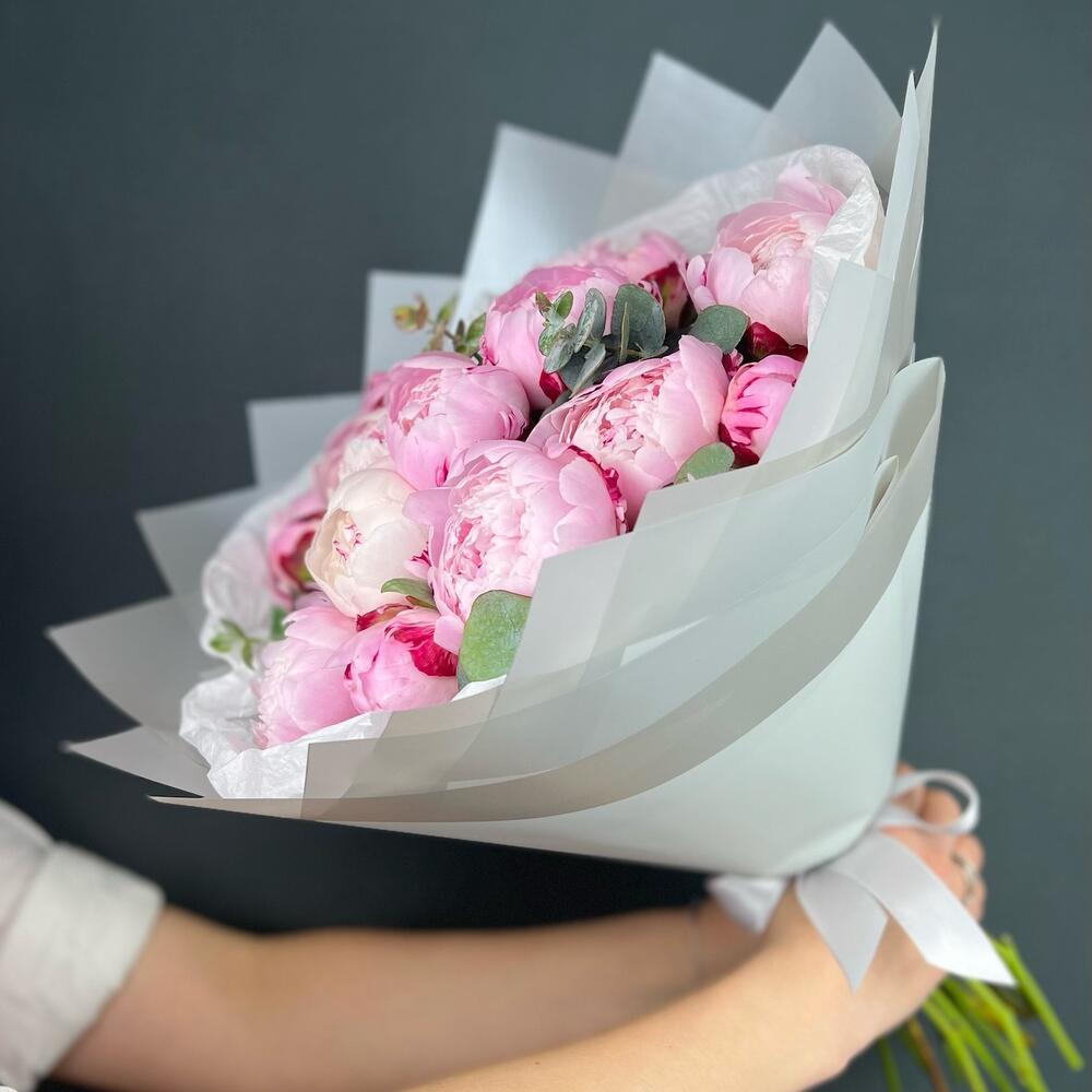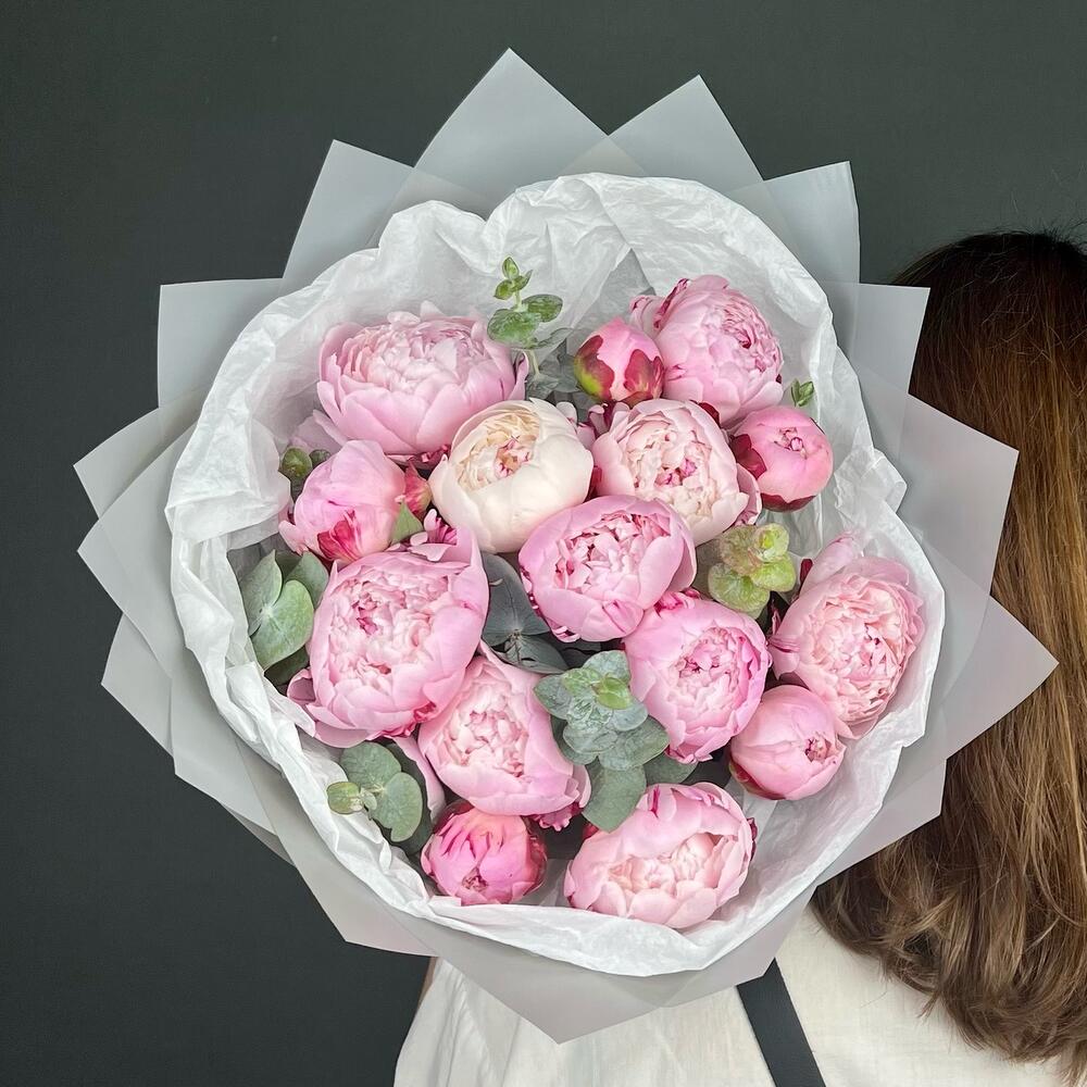 Пион – 15 шт.Эвкалипт – 7 шт.Лента атласная – 1 шт.Бумага тишью – 3 шт.бумага дизайнерская – 6 шт.