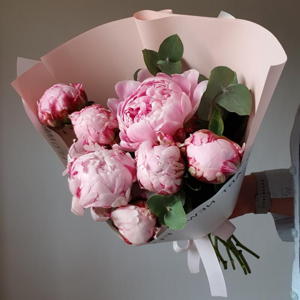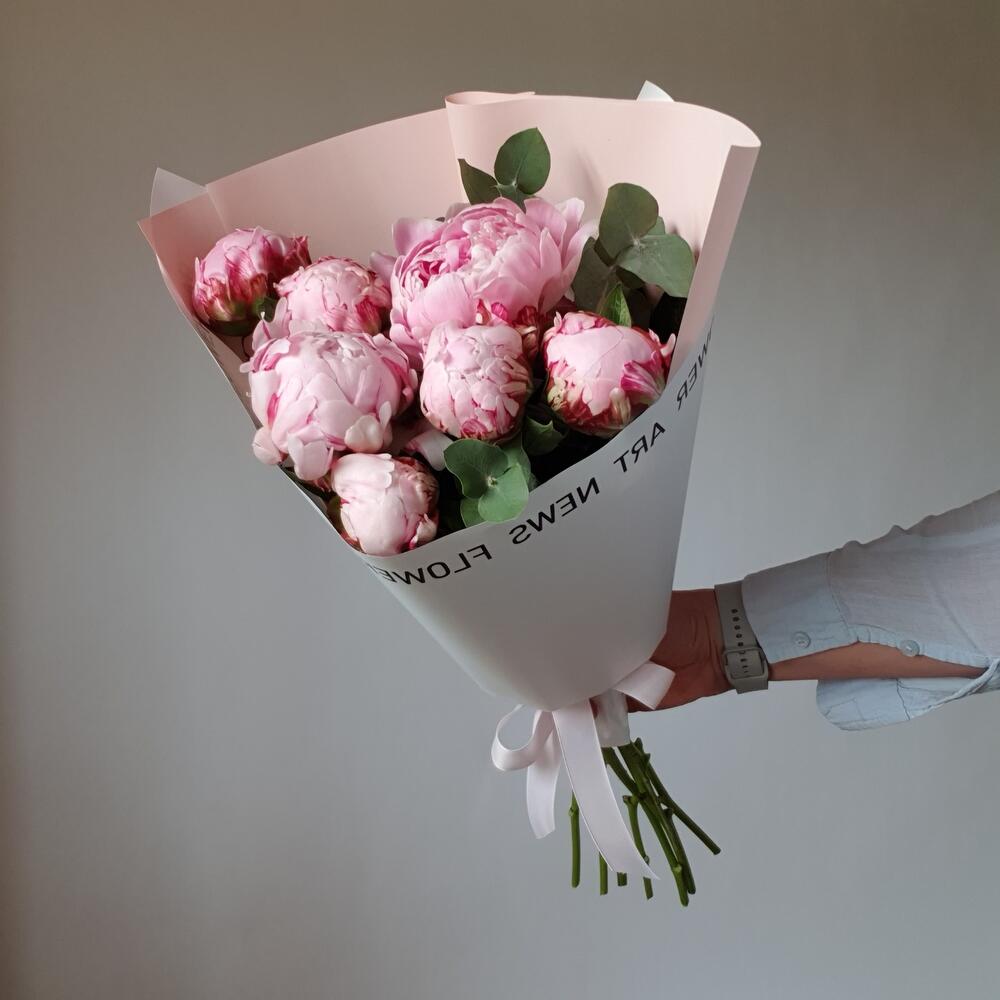Пион – 7 шт.Эвкалипт – 2 шт.Упаковка – 3 шт.Лента атласная – 1 шт.