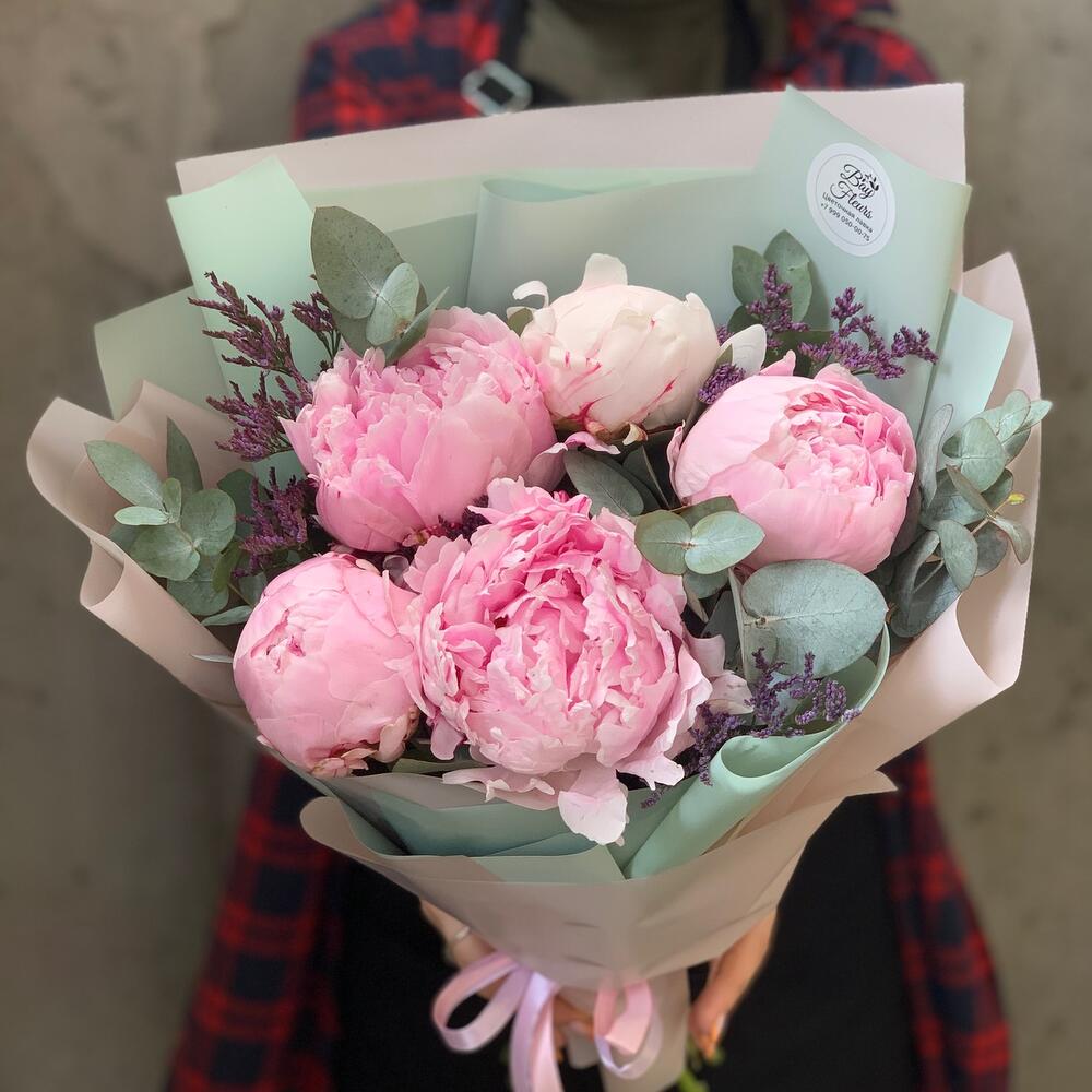 Пион Сара Бернар – 5 шт.Лимониум – 1 шт.Эвкалипт – 1 шт.Упаковка дизайнерская – 1 шт.Лента атласная – 2 шт.