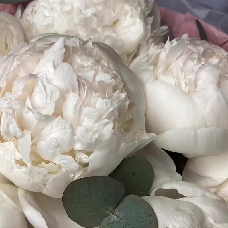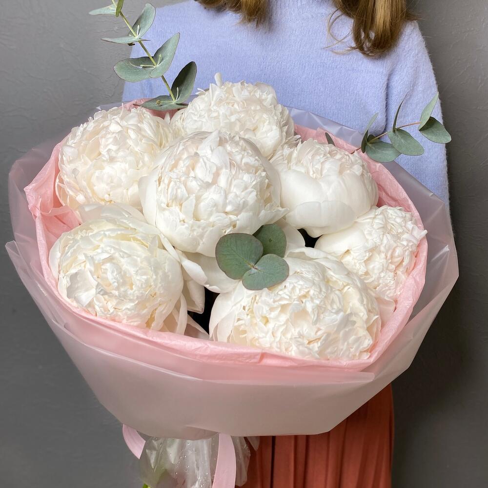 Лента атласная – 1 шт.Тишью – 4 шт.Упаковка дизайнерская – 1 шт.Эвкалипт пучок – 1 шт.пион белый премиум крупный бутон – 7 шт.