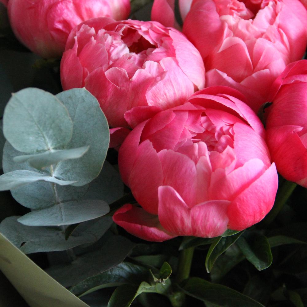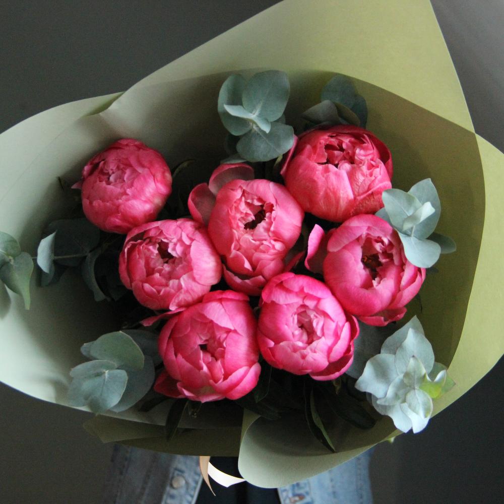 Пион – 7 шт.Эвкалипт – 5 шт.Упаковка – 2 шт.Лента атласная – 2 шт.