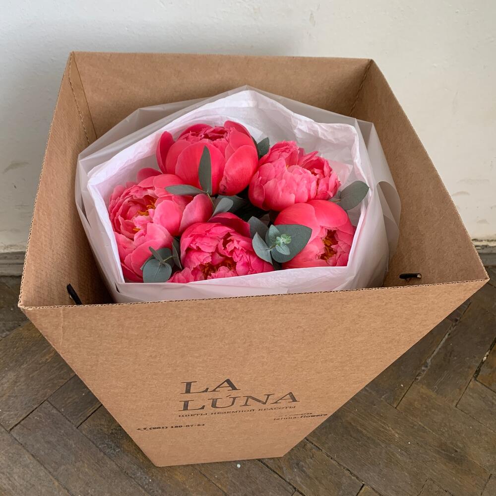 Лента атласная – 1 шт.Упаковка дизайнерская – 1 шт.Кризал (подкормка) – 1 шт.Пион coral sunset – 5 шт.Аквапак – 1 шт.Транспортировочная коробка – 1 шт.инструкция по уходу за цветами – 1 шт.эвкалипт cineria пучок – 1 шт.