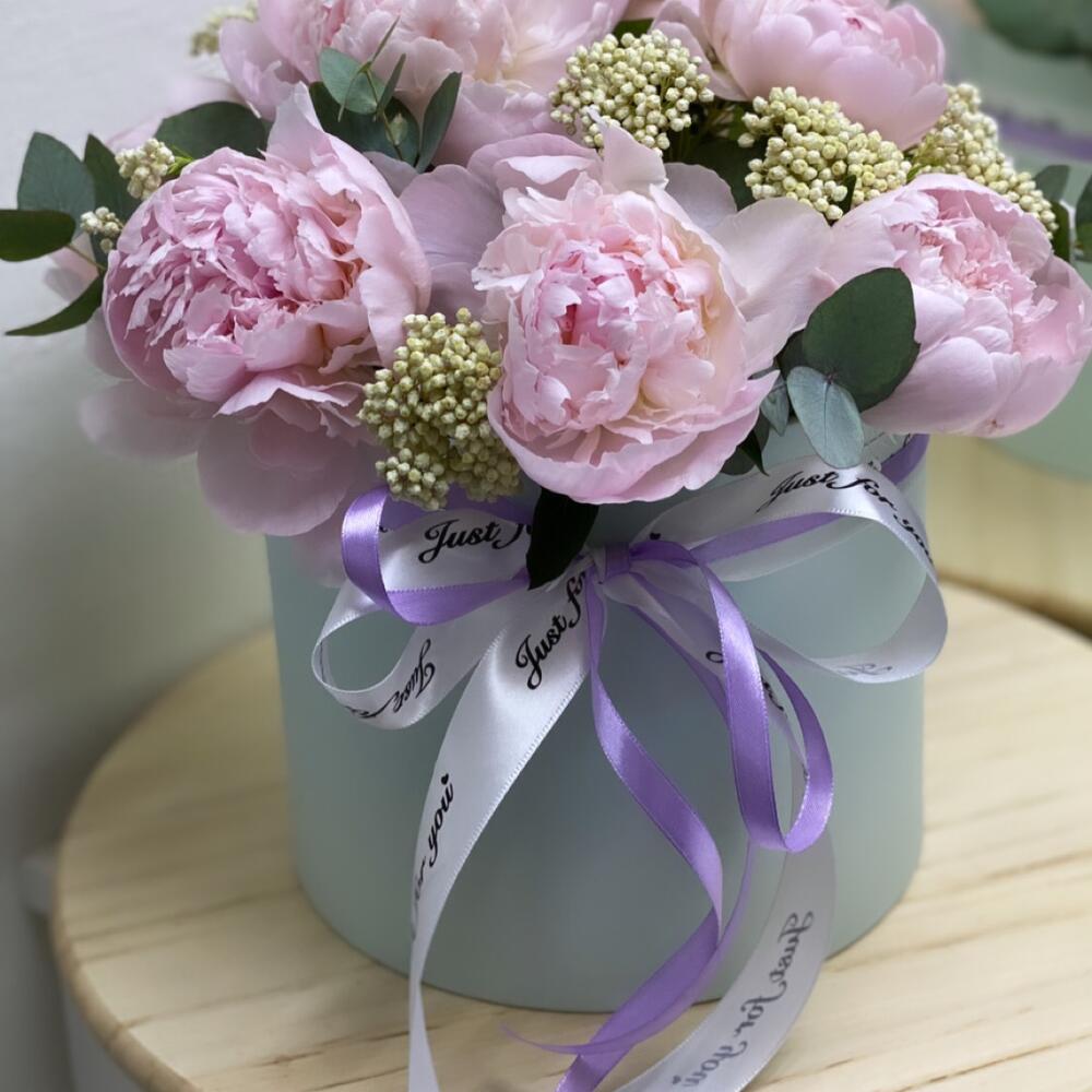 Озотамнус – 5 шт.Эвкалипт – 1 шт.Лента атласная – 2 шт.Коробка шляпная – 1 шт.пионы – 11 шт.