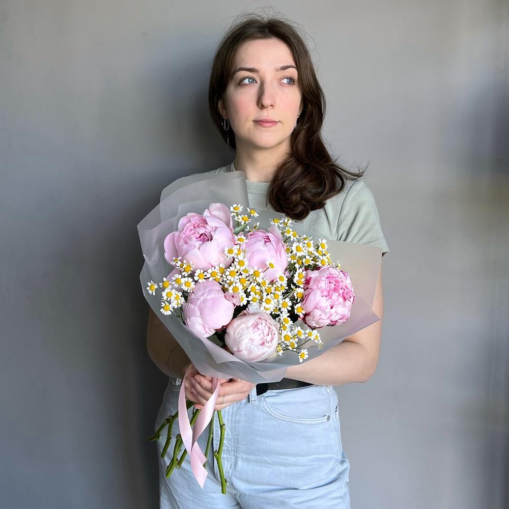 Ароматный букет в нежнейшем и одном из самых крутых сочетаний: пионы и ромашка!Не забудьте подрезать цветы перед тем как ставить в воду. Не храните букет на прямых солнечных лучах и возле отопительных приборов, чтобы сохранить цветы как можно дольше.