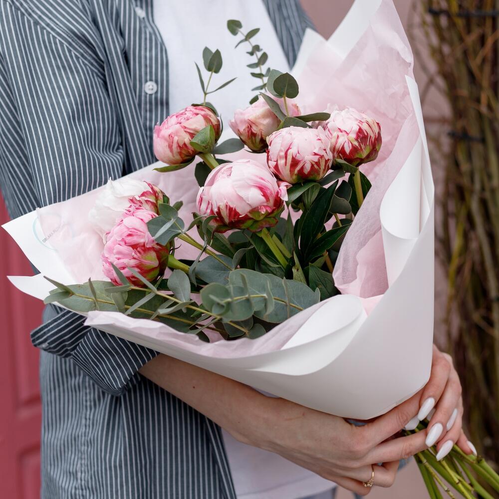 Ароматный букет в нежнейшем и одном из самых крутых сочетаний: пионы и эвкалипт.Не забудьте подрезать цветы перед тем как ставить в воду. Не храните букет на прямых солнечных лучах и возле отопительных приборов, чтобы сохранить цветы как можно дольше.К букету можно добавить открытку, воздушные шары, плюшевую игрушку. Что бы вам подарок остался не забываем .
