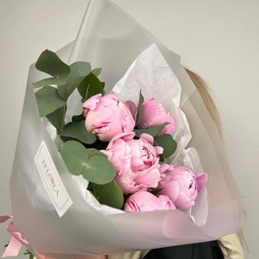 Нежно-розовые пионы 5 шт с эвкалиптом в дизайнерской упаковке – отличный комплимент любой девушкеК букету в качестве подарка подкрепим кризал, инструкцию по уходу за цветами и шоколадку!