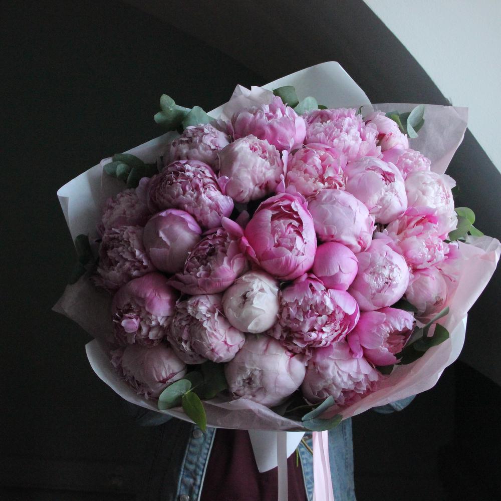 Роскошный букет из 29 голландских пионов Сара Бернар.Стильное цветочное решение для любого случая.Ширина букета около 60 сантиметров, высота пионов около 65 сантиметров.