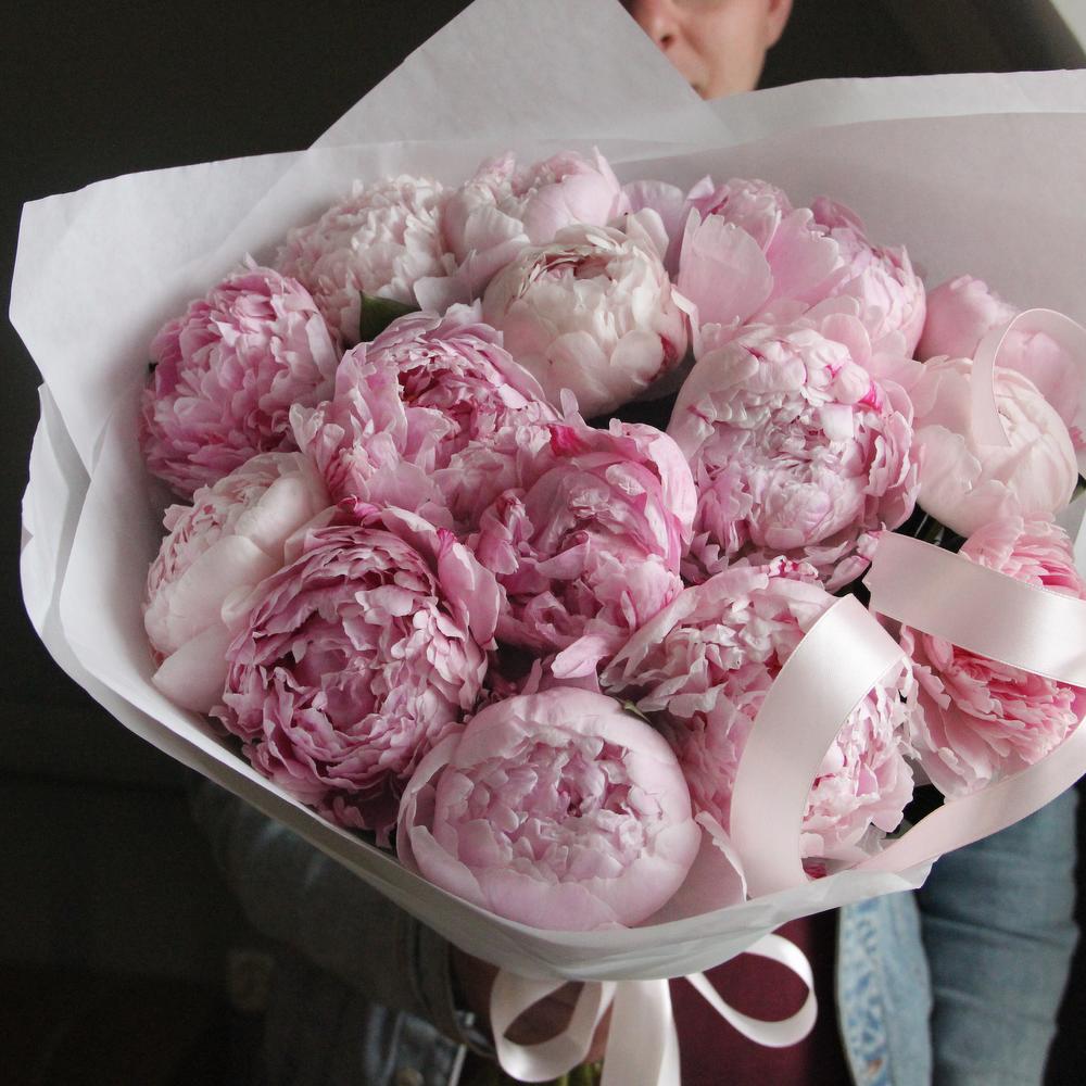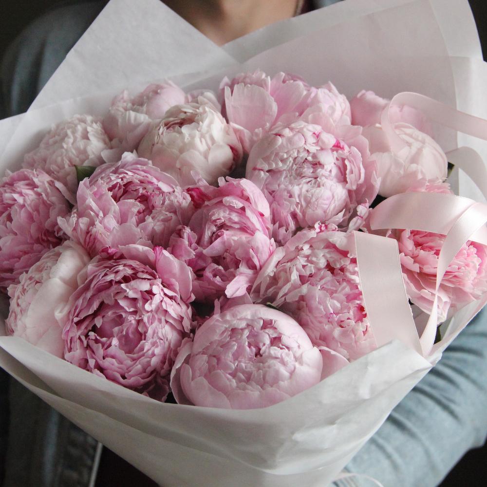 Нежный розовый букет из 15 пионов в лаконичной упаковке.Стильное цветочное решение для любого случая.Ширина букета около 40 сантиметров, высота пионов около 60 сантиметров.