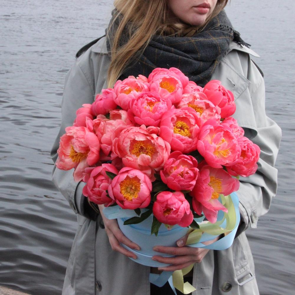 Шляпная коробка с несравненными коралловыми пионами.Стильное цветочное решение для любого случая.