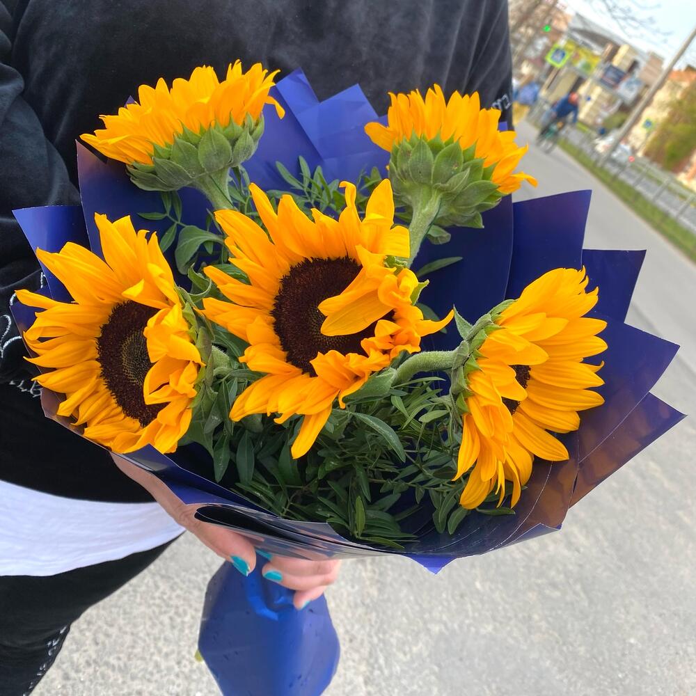Лента атласная – 1 шт.Подсолнух – 5 шт.Фисташка – 5 шт.Упаковка дизайнерская – 1 шт.