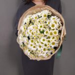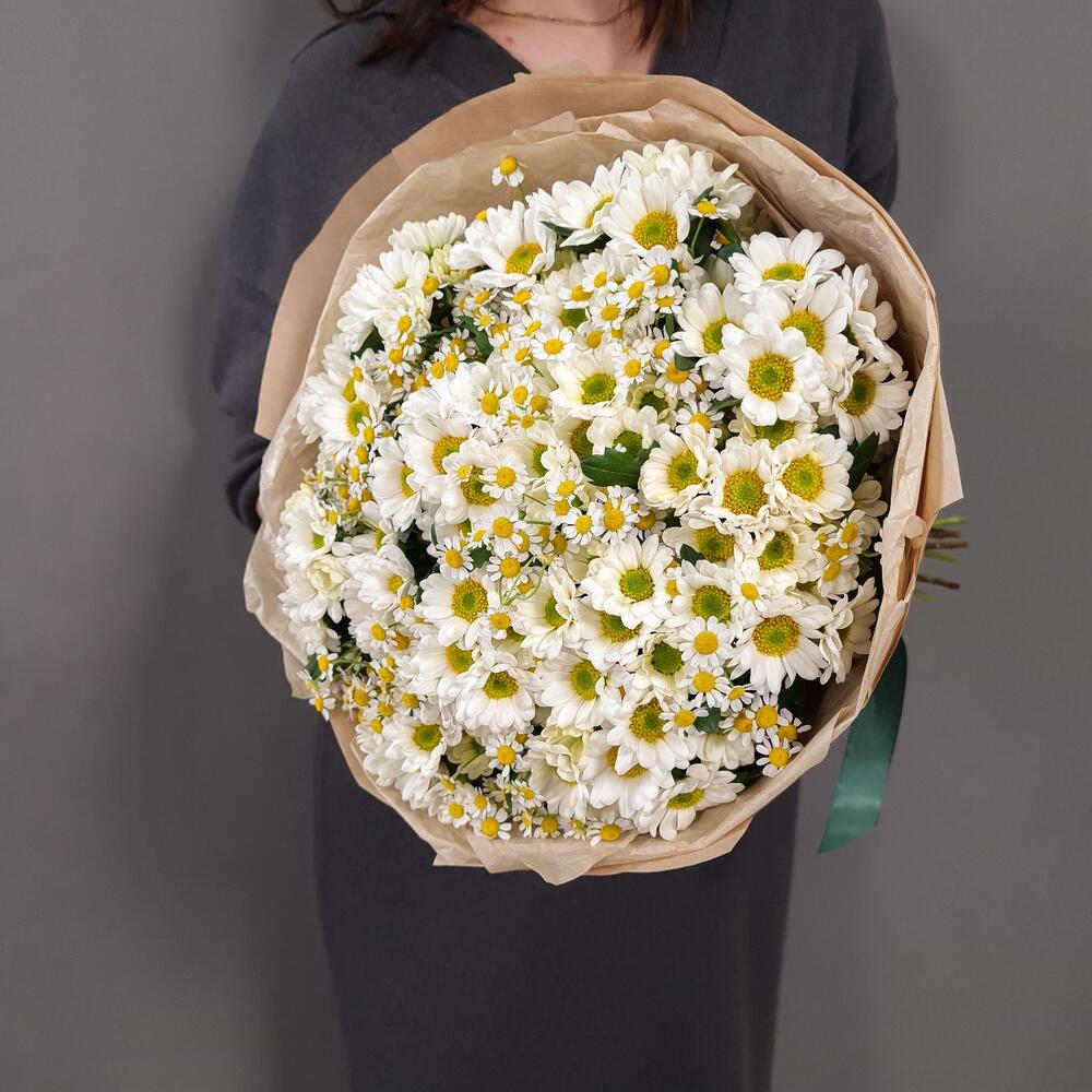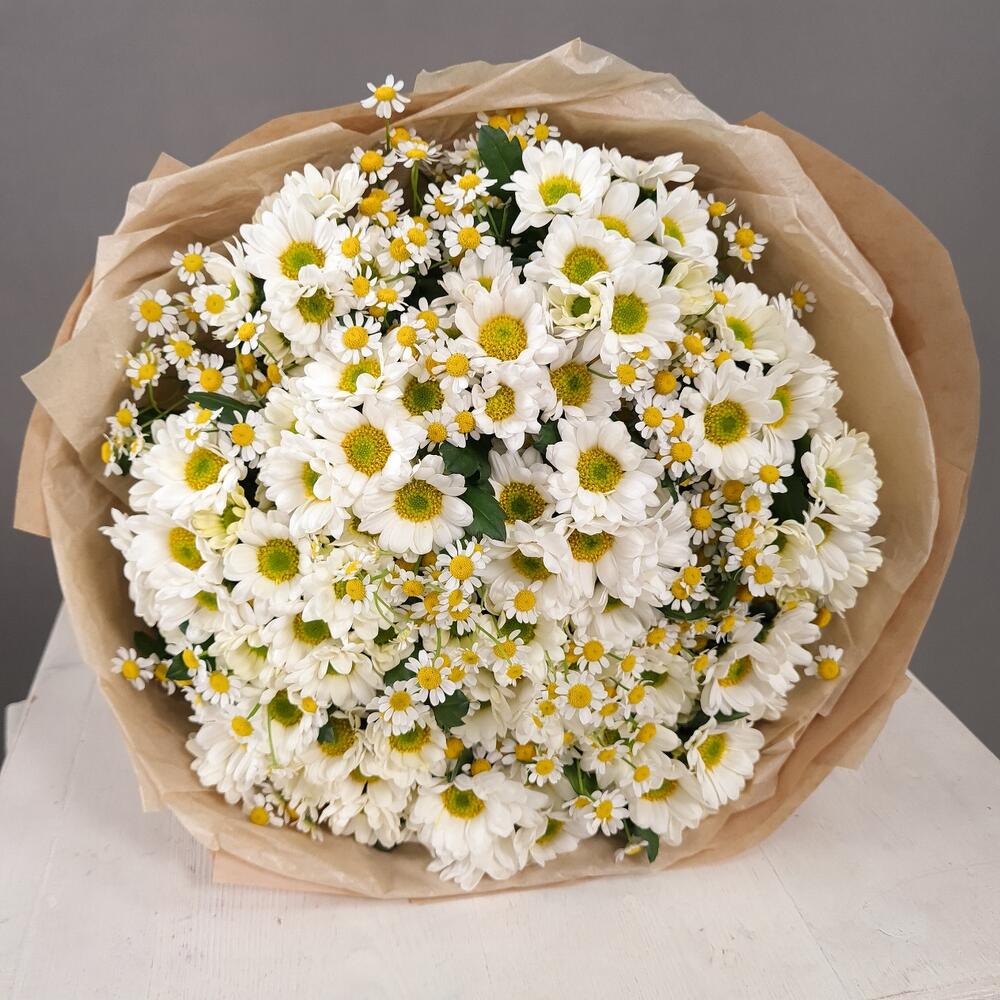 Ромашка кустовая – 13 шт.Аквапак – 1 шт.Сантини Росси Вайт – 12 шт.Упаковка крафт – 1 шт.витамины для цветов – 2 шт.