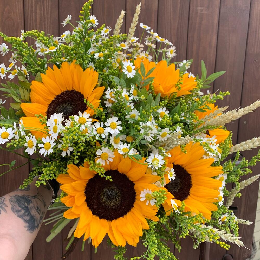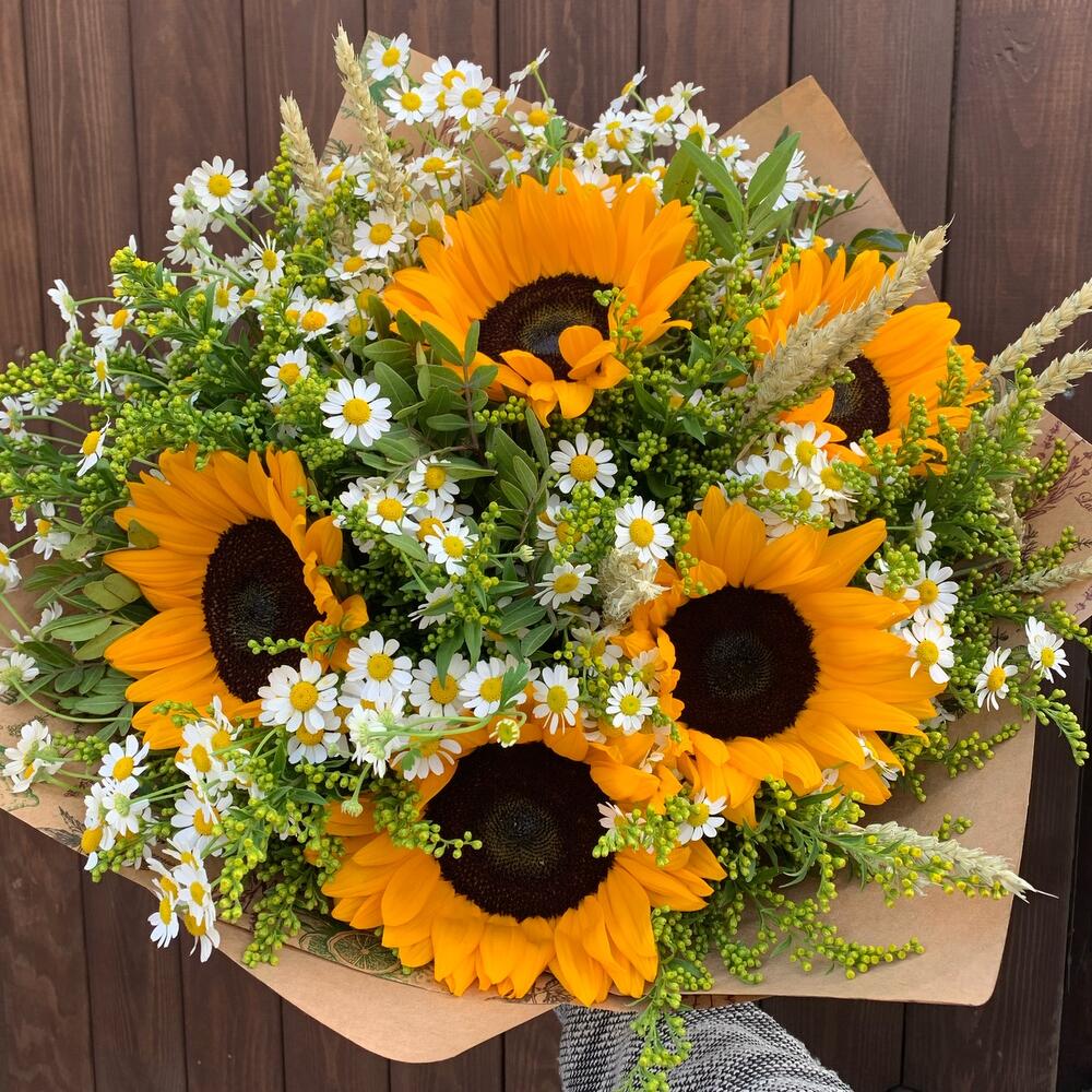 Подсолнух – 5 шт.Матрикария (Ромашка Камила) – 7 шт.Солидаго – 5 шт.триникум – 7 шт.Зелень – 3 шт.