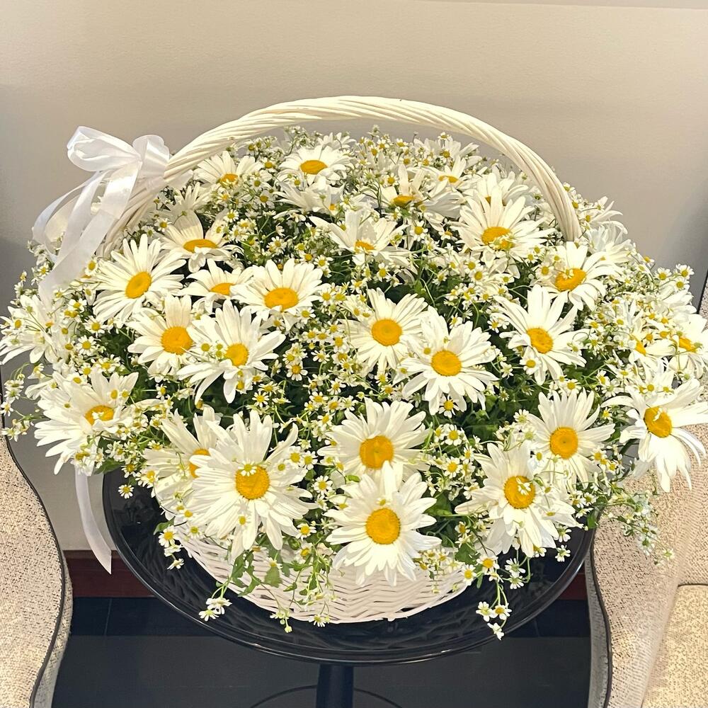Ромашка одноголовая – 51 шт.Ромашка кустовая – 100 шт.Корзина плетеная – 1 шт.Лента атласная – 2 шт.Кризал – 1 шт.Открыточка с вашими пожеланиями – 1 шт.инструкция по уходу за цветами – 1 шт.хорошее настроение – 100 шт.