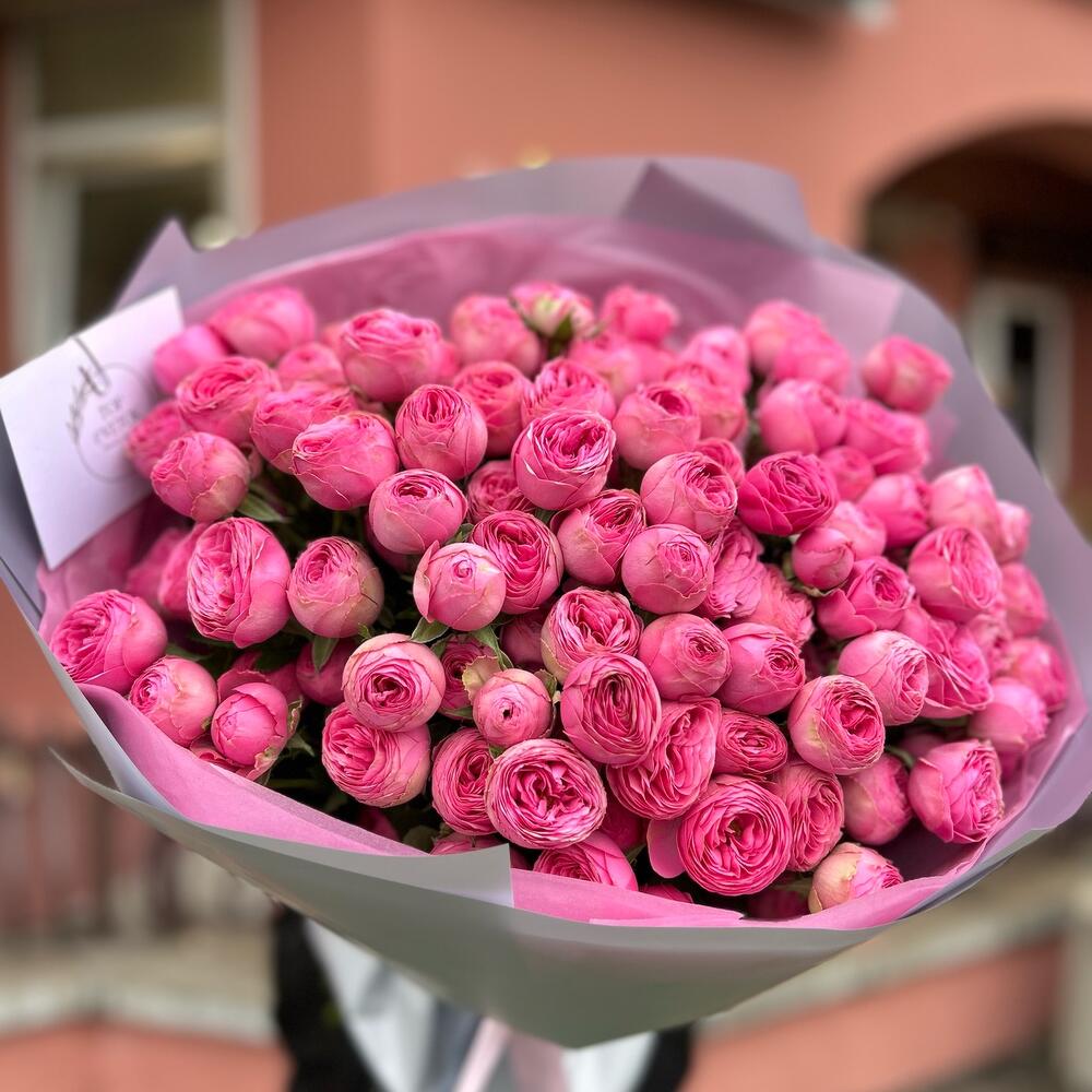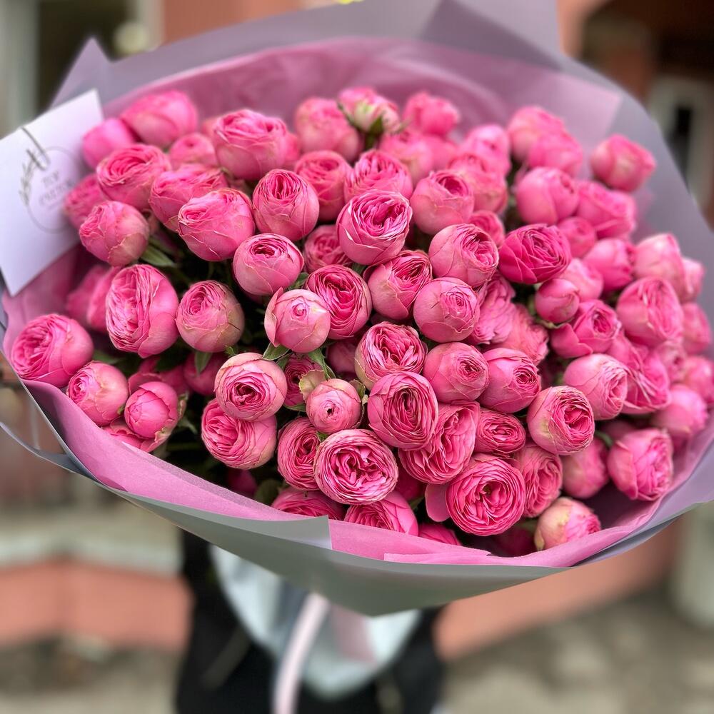Букет из 25 веток кустовых пионовидных роз ,в дизайнерском оформлении. Количество розочек (бутонов ) в букете может достигать 151 штуки