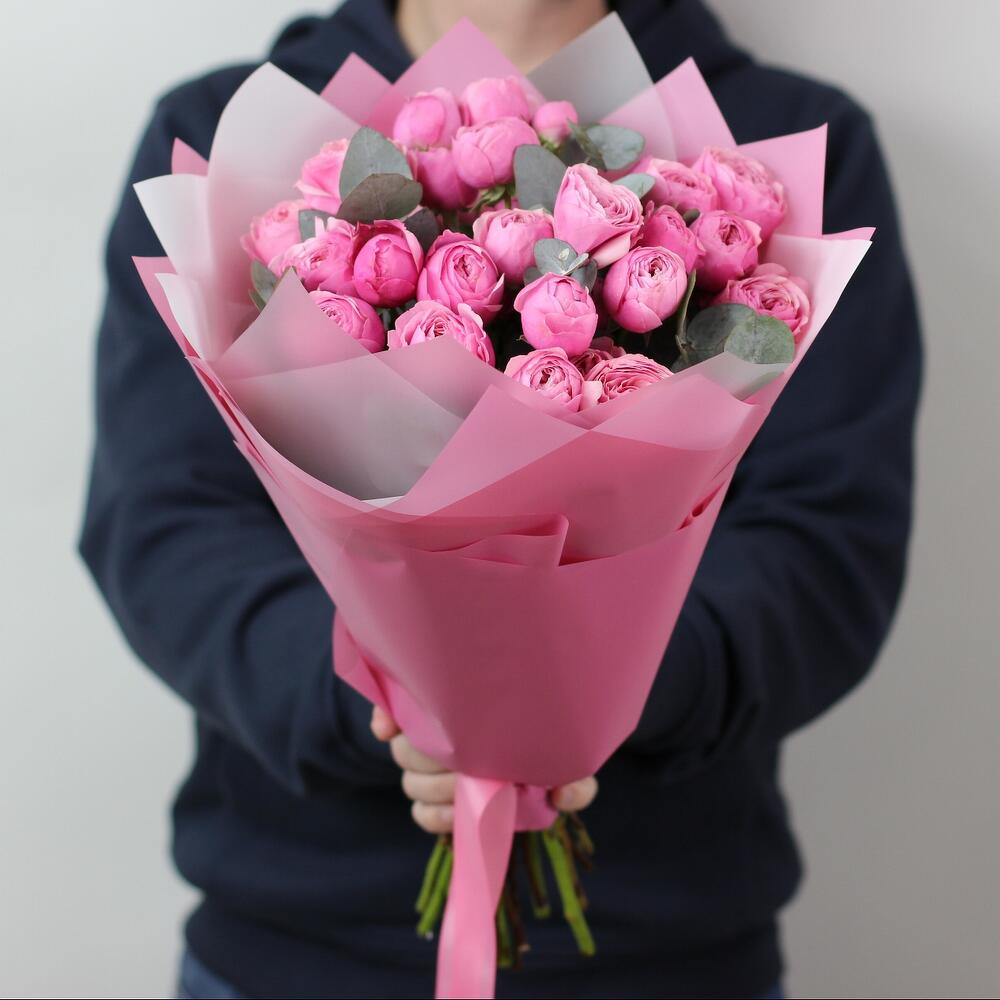 7 кустовых пионовидных роз сильва пинк с эвкалиптом. Букет 25 KimFlo