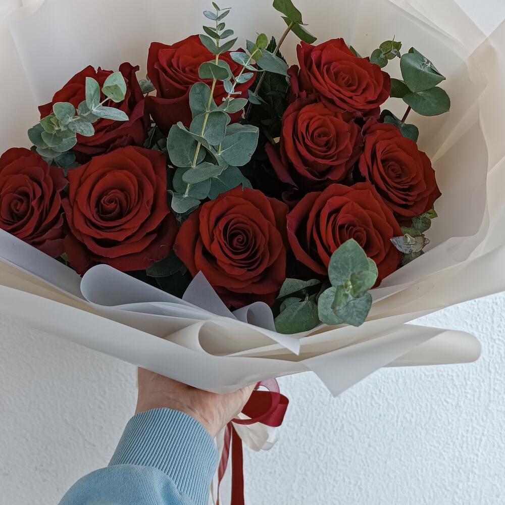 9 роз с эвкалиптом