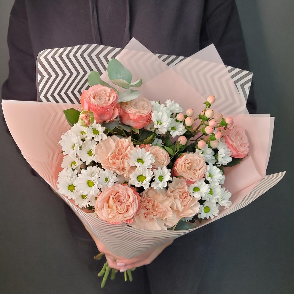 Гиперикум – 1 шт.Эвкалипт – 1 шт.Лента атласная – 1 шт.Диантус – 3 шт.Сантини – 5 шт.Роза кустовая пионовидная – 2 шт.Упаковка дизайнерская – 1 шт.