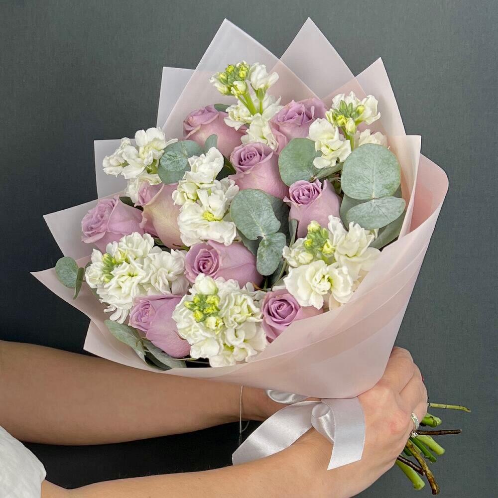 Авторский букет из фиолетовых Роз и белой Маттиолы