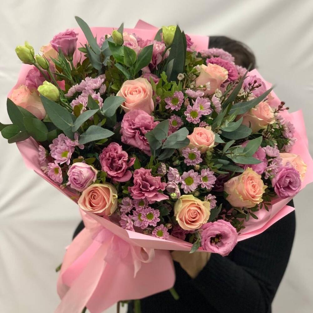 Роза Эквадор – 11 шт.Сантини – 8 шт.Лизиантус – 6 шт.Ваксфлауэр – 2 шт.Фисташка – 5 шт.Эвкалипт – 3 шт.Упаковка дизайнерская – 3 шт.Лента атласная – 1 шт.