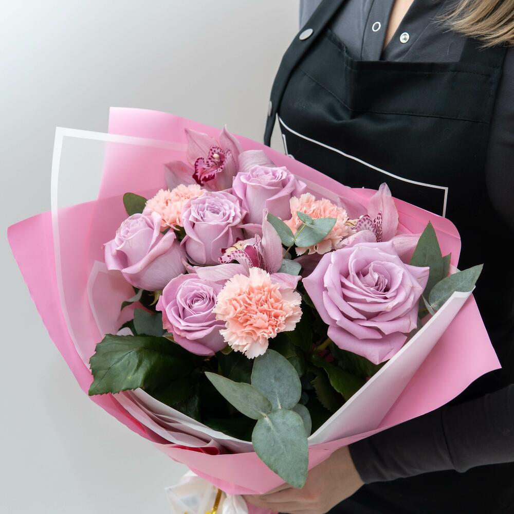 Авторский букет: орхидея розовая, диантус персиковый и роза розовая Маритим