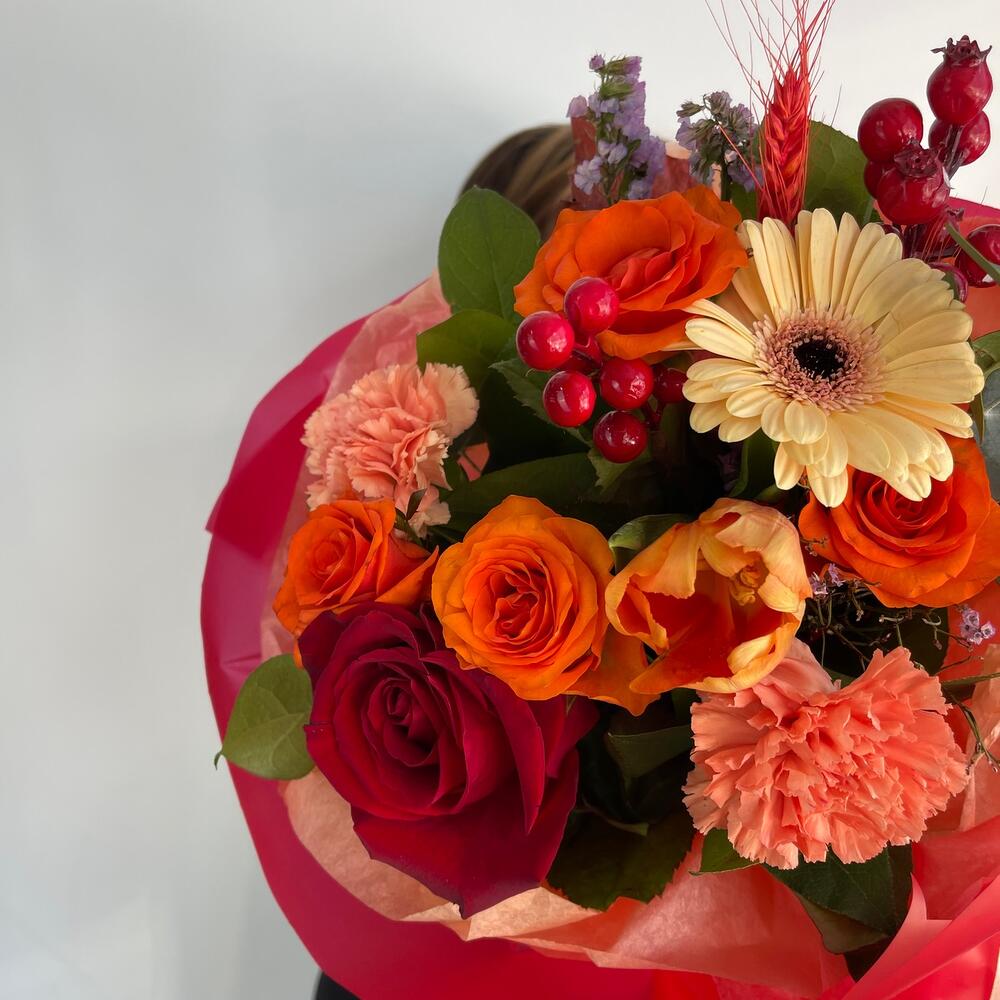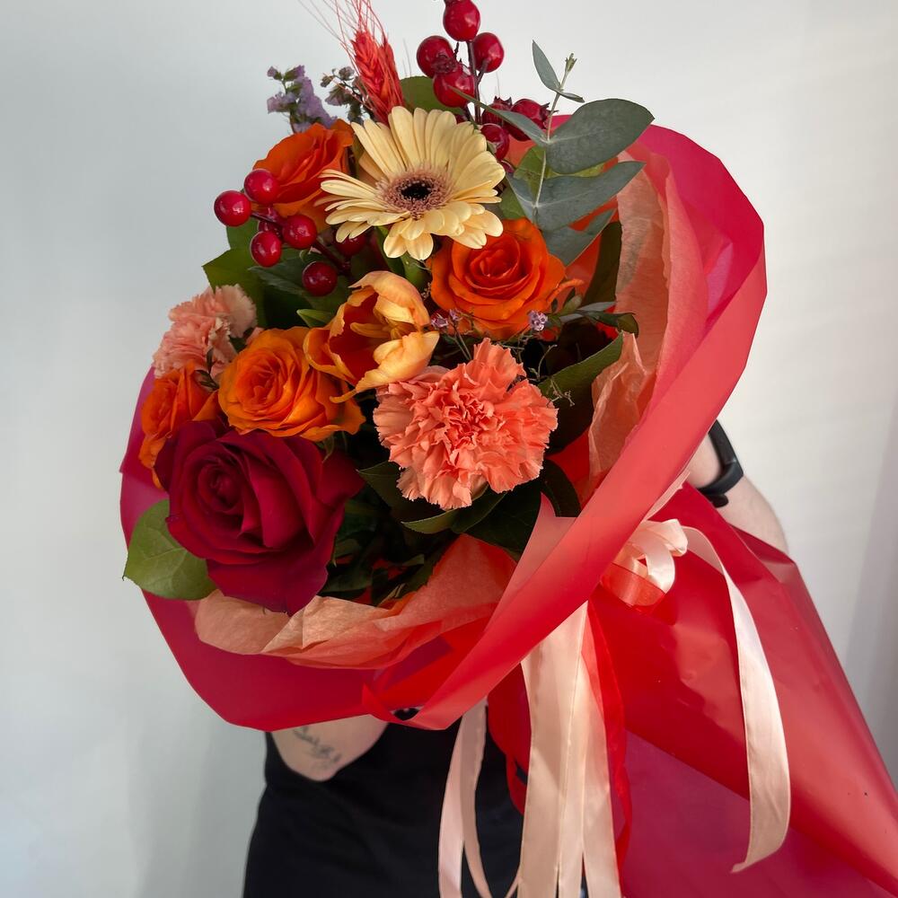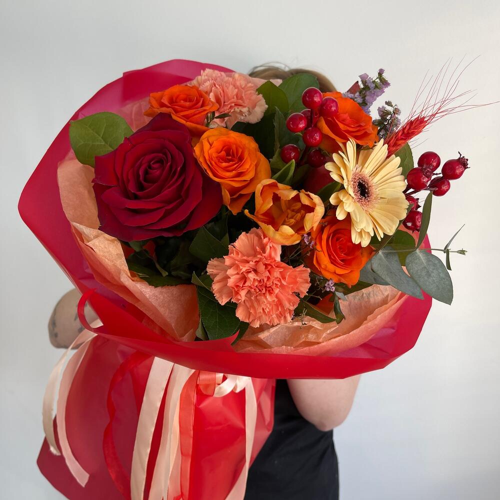 Роза – 5 шт.Гербера – 1 шт.Диантус – 2 шт.Тюльпан – 1 шт.Пшеница – 2 шт.Ягоды декоративные – 2 шт.Салал пучок – 1 шт.Упаковка дизайнерская – 2 шт.Лента атласная – 2 шт.