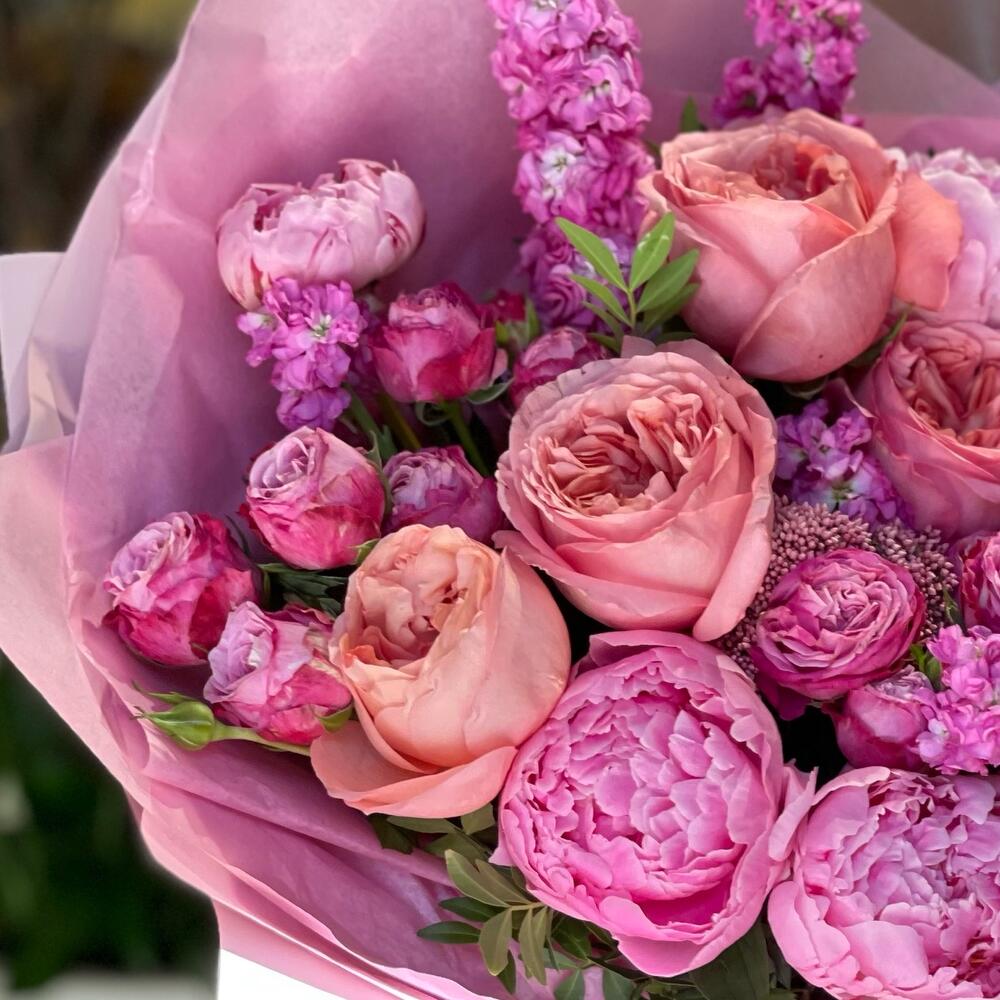 Маттиола – 7 шт.Роза кустовая пионовидная – 3 шт.Пион Сара Бернар – 4 шт.Упаковка дизайнерская – 1 шт.роза пинк экспрешн – 4 шт.
