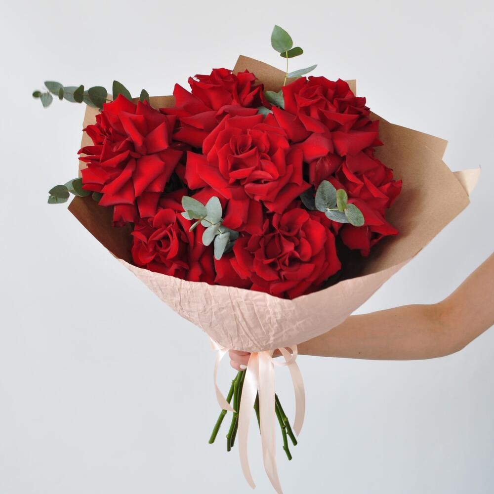 Бархатные французские розы с эвкалиптом, 7 штучек