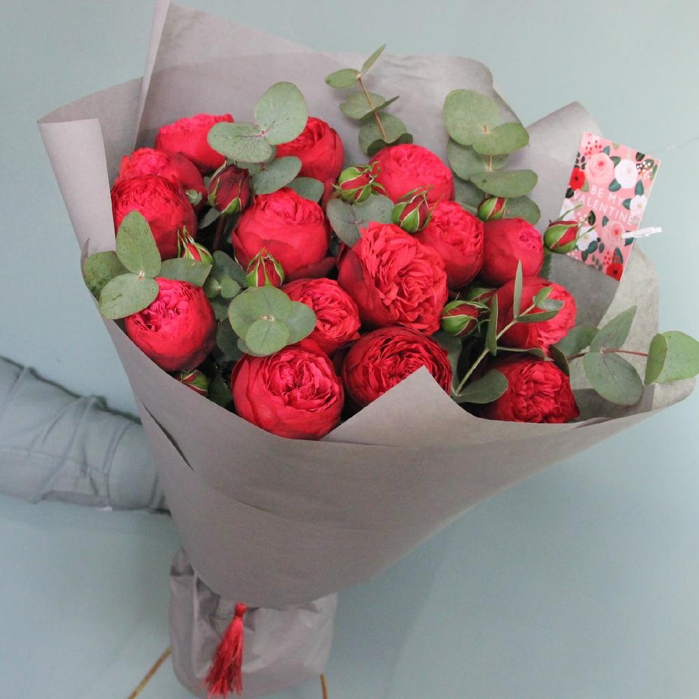 Роза пионовидная – 15 шт.Эвкалипт – 7 шт.Упаковка дизайнерская – 3 шт.Лента атласная – 2 шт.Открытка – 1 шт.