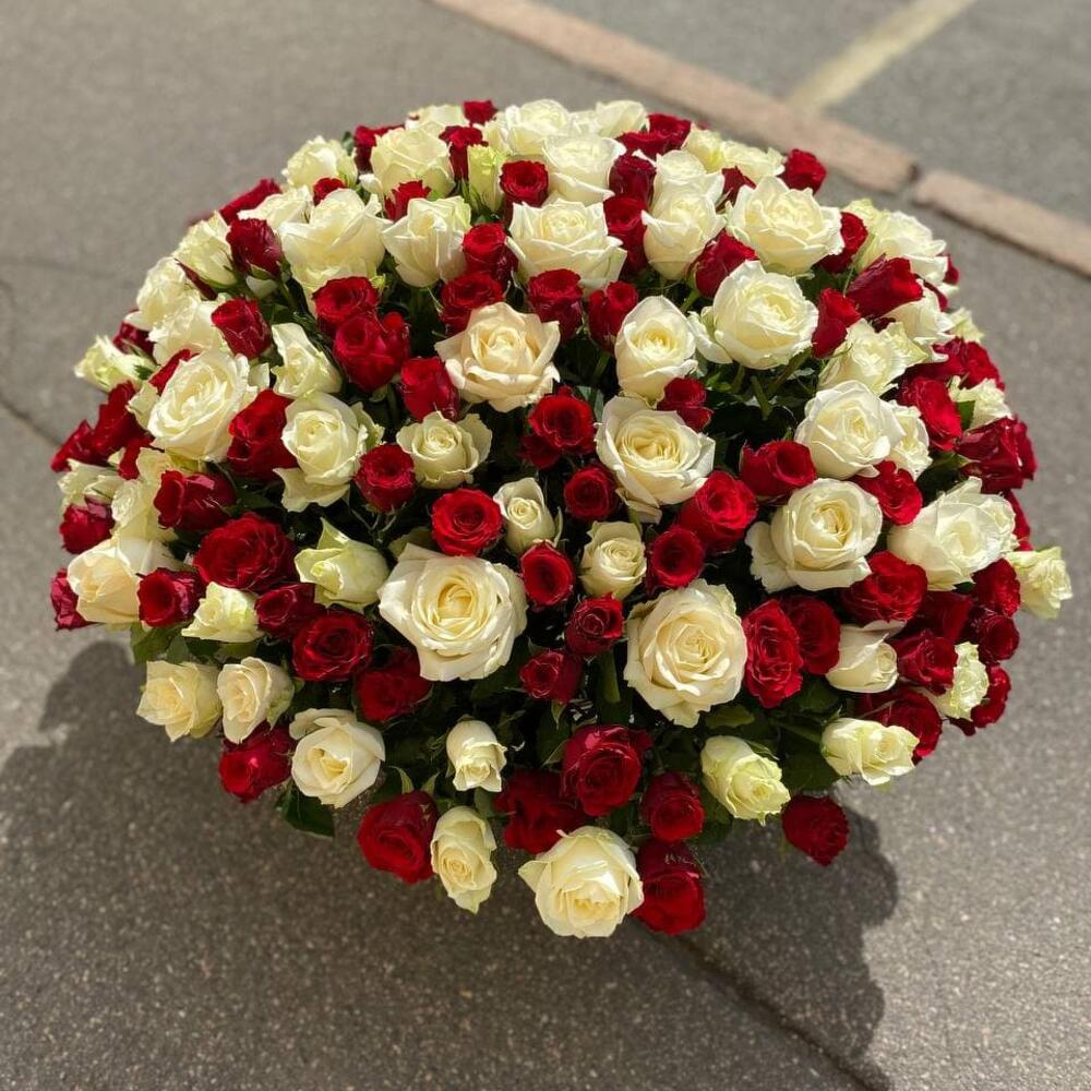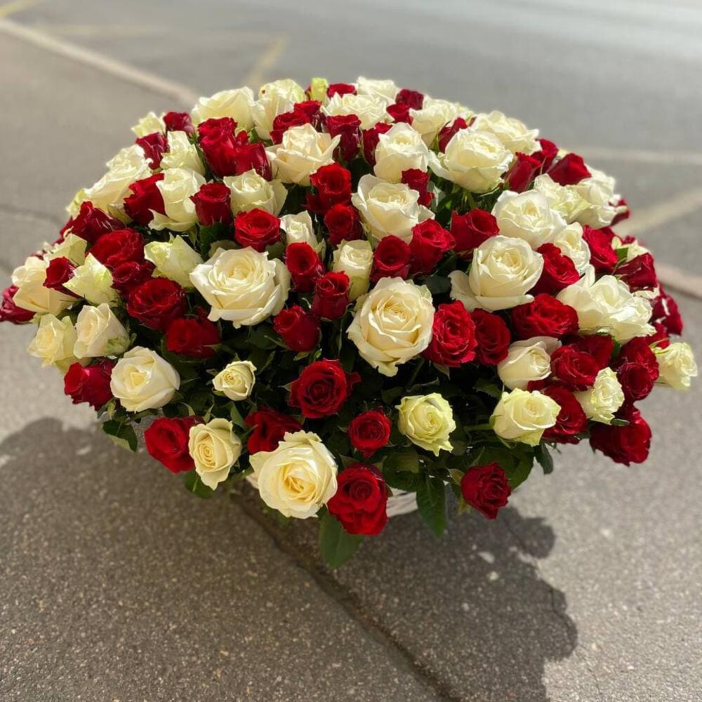 Большая корзина из 201 красной и белой розы “Красно-белая фреска”