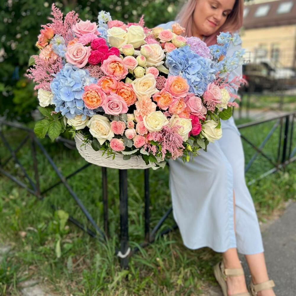Гортензия – 5 шт.пион розы джульетта – 7 шт.Кустовая пионовидная роза – 5 шт.Кустовая роза – 7 шт.кустовая яркая роза – 5 шт.роза эскимо – 5 шт.Озотамнус – 5 шт.Эустома – 5 шт.Эвкалипт – 4 шт.Корзина – 1 шт.Оазис – 3 шт.однополая белая роза – 13 шт.одноголовая пионовидная роза кантри блю – 5 шт.Гвоздика – 11 шт.