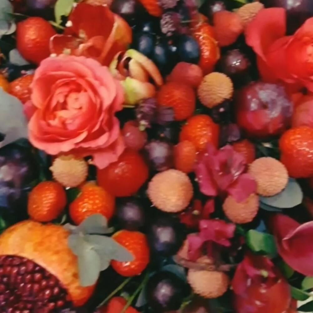 Клубника – 15 шт.Роза красная – 7 шт.Лента атласная – 1 шт.Гранат – 1 шт.Слива – 5 шт.Виноградная лоза – 9 шт.Виноград гроздь – 5 шт.зелень декоративная – 10 шт.виноград черный – 2 шт.экзотика – 7 шт.микс цветов – 11 шт.упаковка дизайнерская1 – 1 шт.