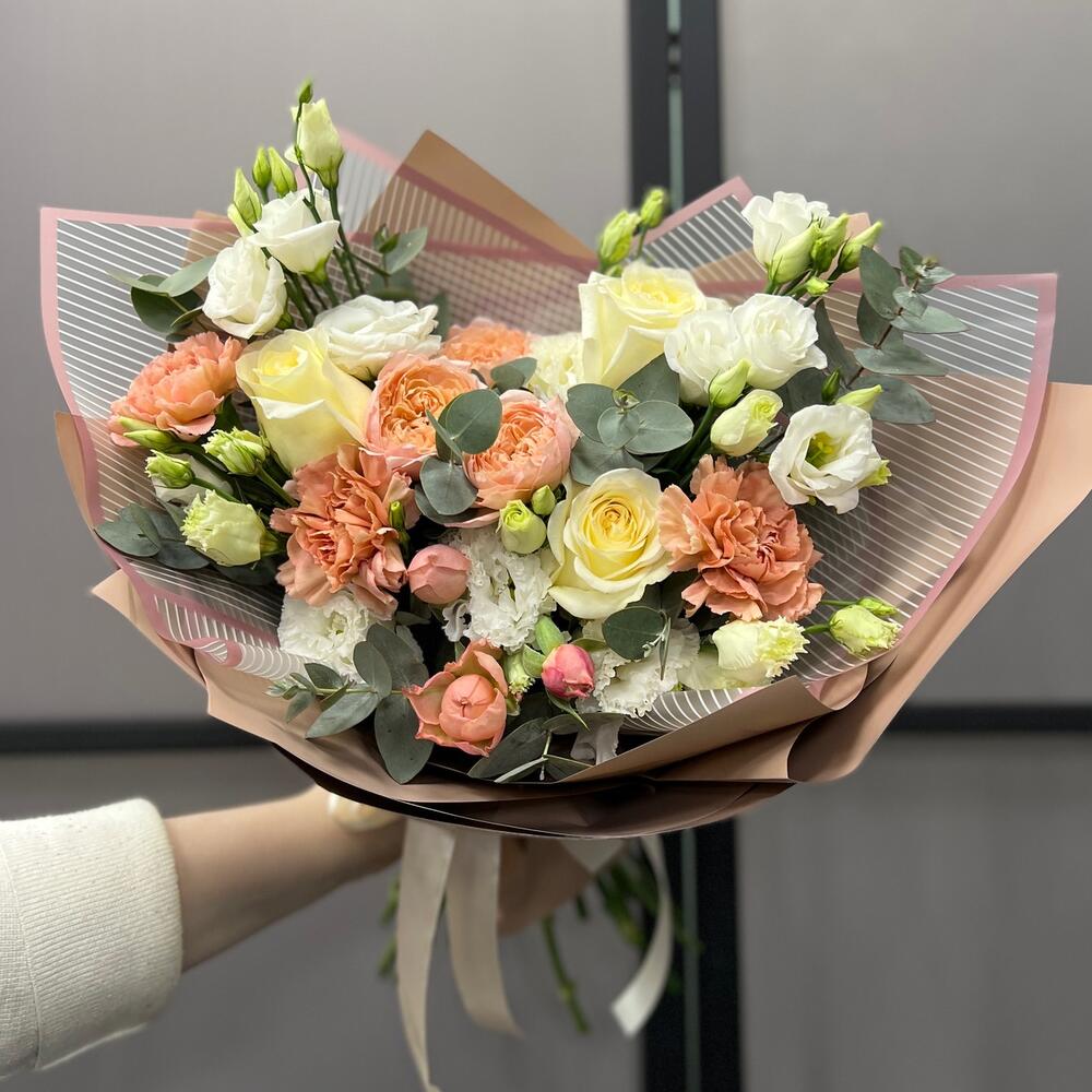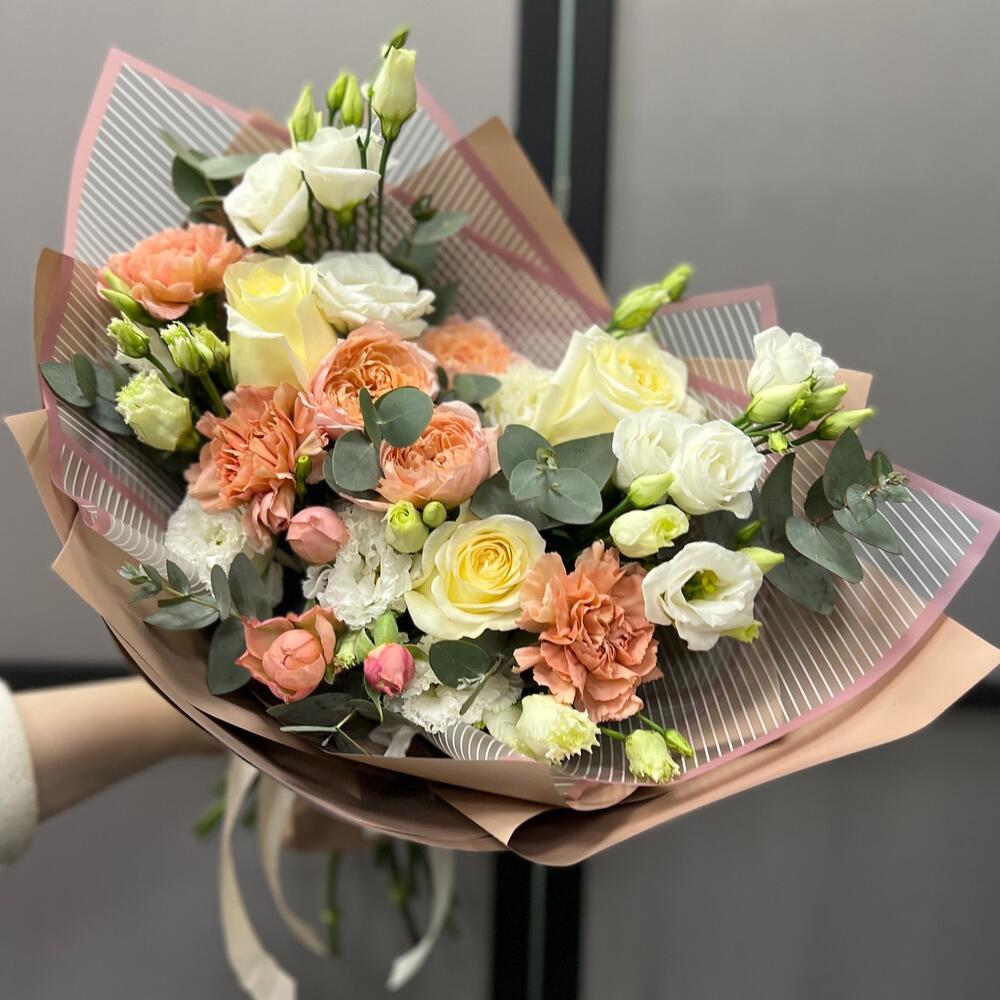 Эвкалипт – 3 шт.Лента атласная – 2 шт.Диантус – 3 шт.Роза пионовидная Джульетта – 1 шт.Пленка матовая – 5 шт.Эустома белая махровая – 2 шт.эустома розита вайт – 2 шт.роза пионовидная кэндллайт – 3 шт.
