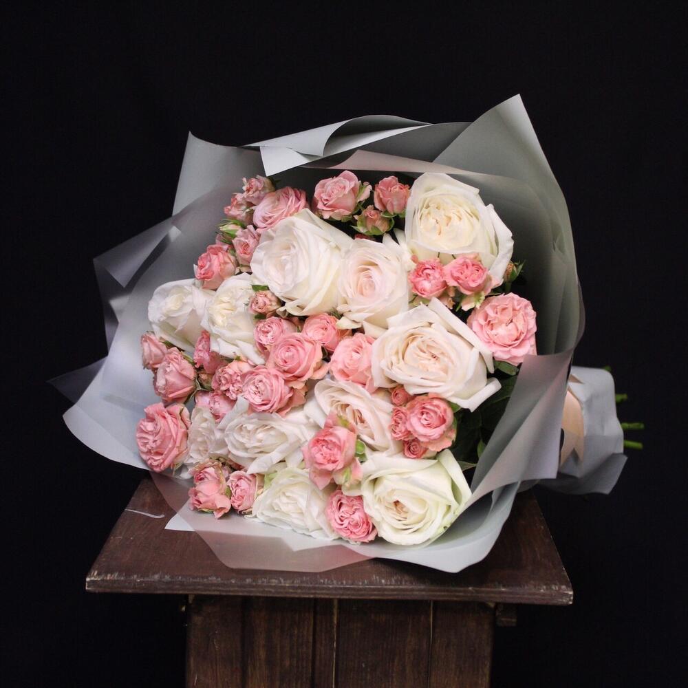 роза пионовидная white o’hara – 11 шт.Роза кустовая пионовидная мадам бомбастик – 12 шт.Пленка дизайнерская – 5 шт.Лента атласная – 1 шт.