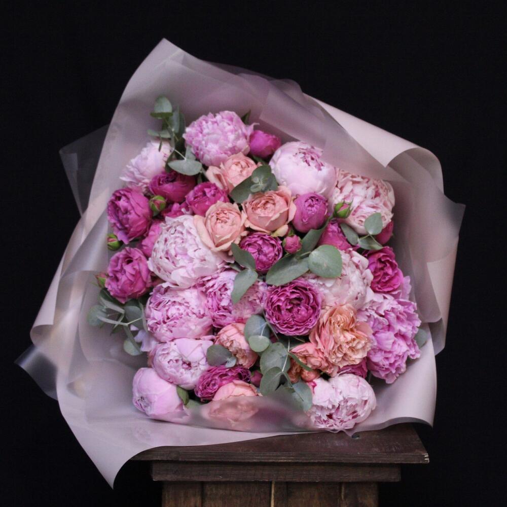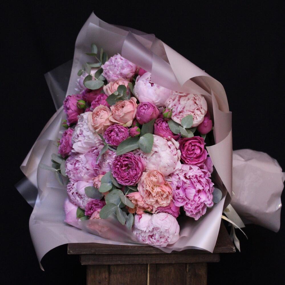 Эвкалипт – 3 шт.Лента атласная – 1 шт.Пион Сара Бернар – 11 шт.Пленка дизайнерская – 3 шт.Роза кустовая пионовидная джульетта – 3 шт.роза кустовая пионовидная misty bubbles – 5 шт.