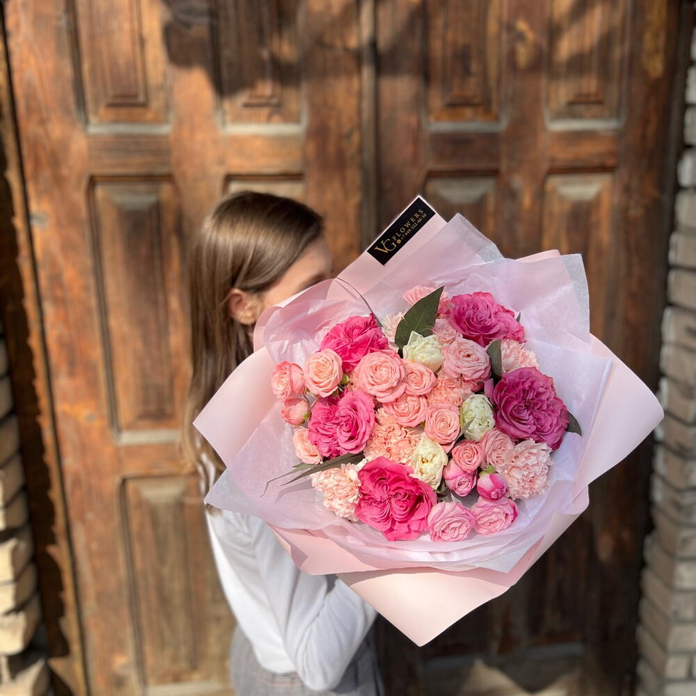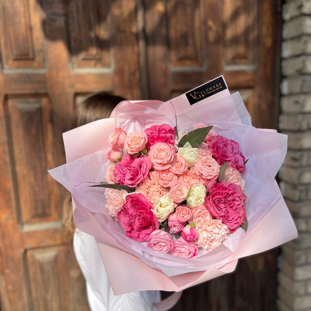 Гвоздики, Лизиантусы, Розы, Тюльпаны