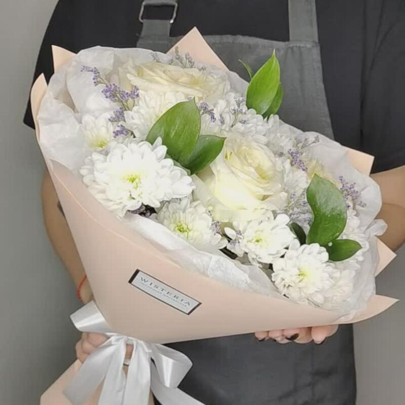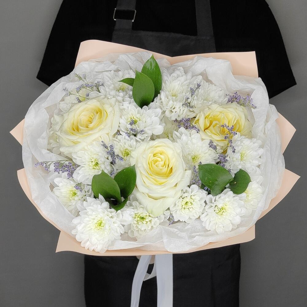Лимониум – 1 шт.Рускус – 3 шт.Хризантема кустовая – 4 шт.Лента атласная – 1 шт.Упаковка дизайнерская – 1 шт.Роза одноголовая эквадор – 3 шт.тишью белая – 1 шт.