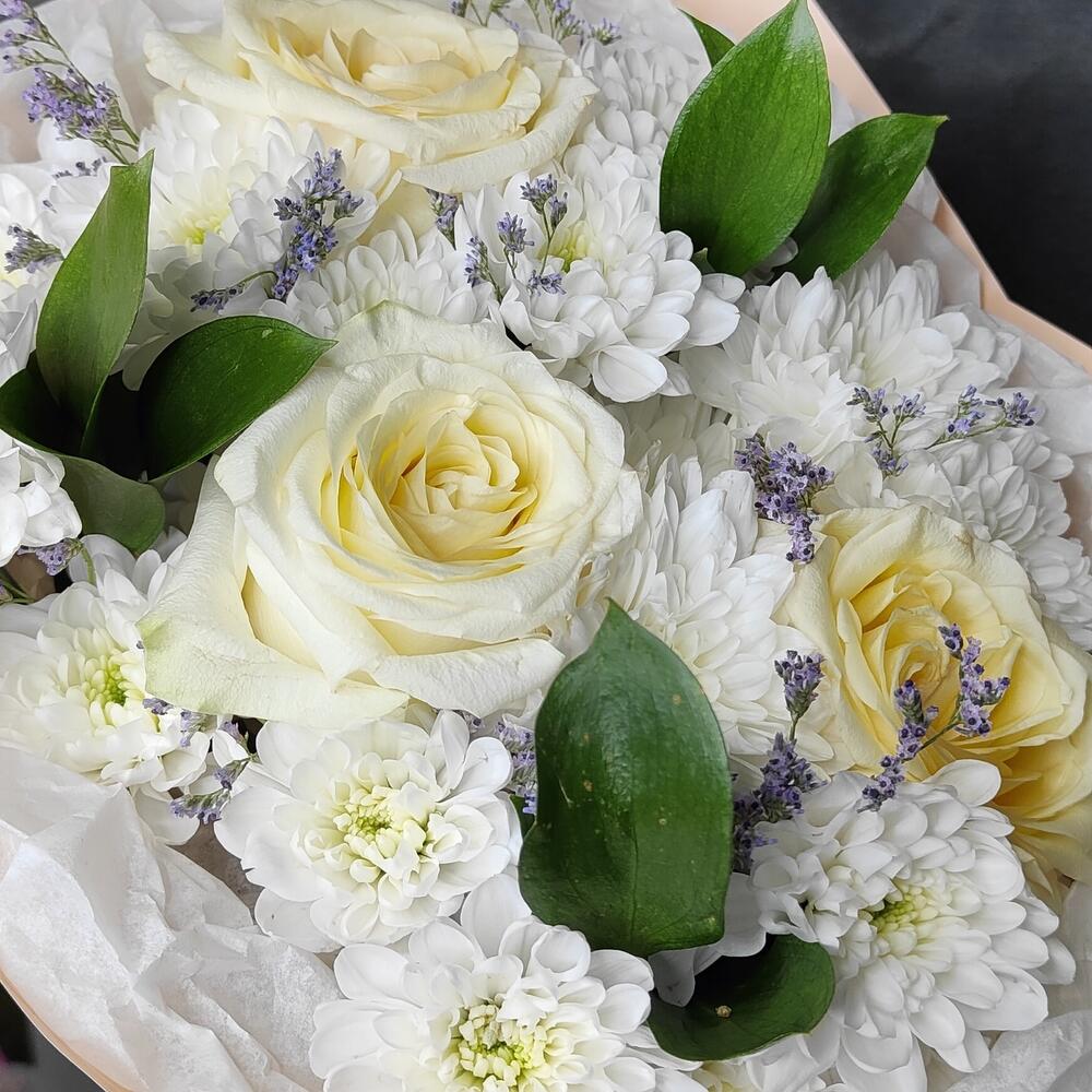 Букет ароматных роз, хризантемы и лилового лимониума "Нежность"