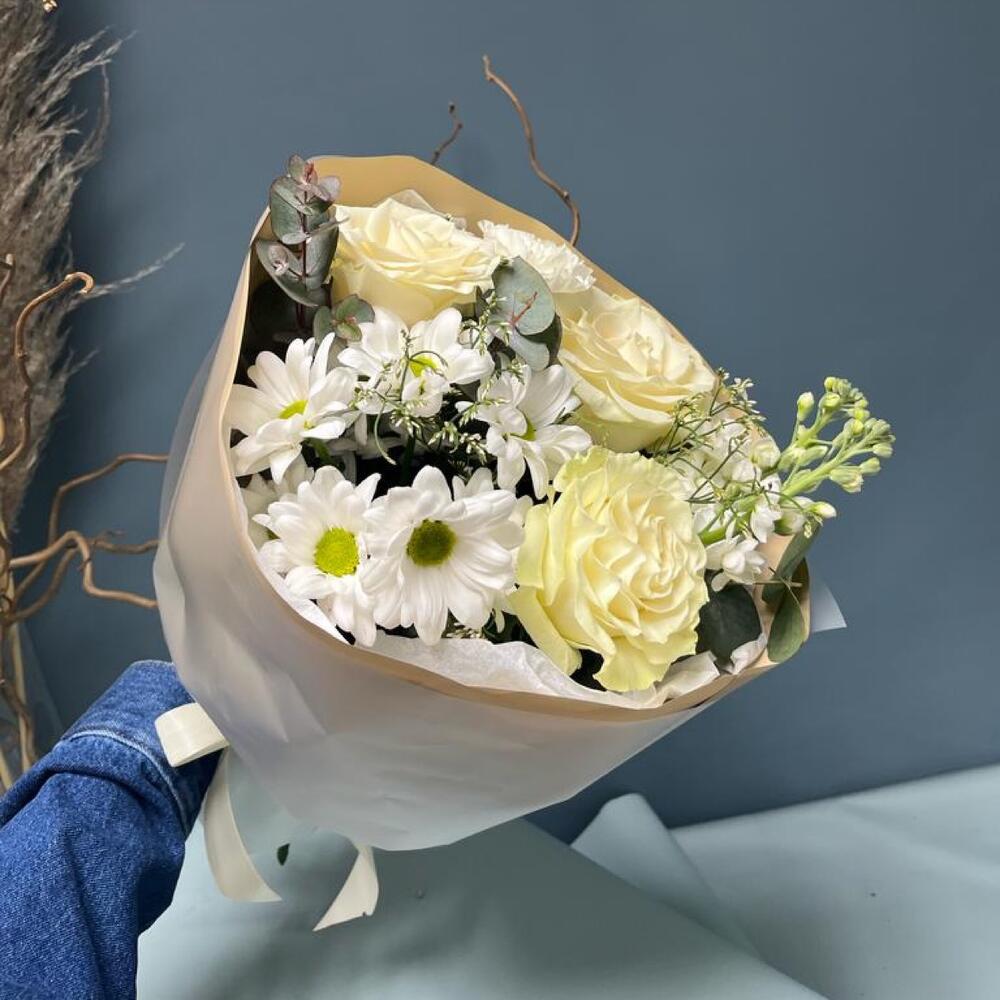 Букет «Ароматный» с розами, маттиолой, хризантемой и гвоздикой