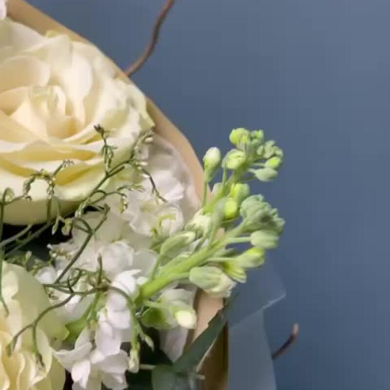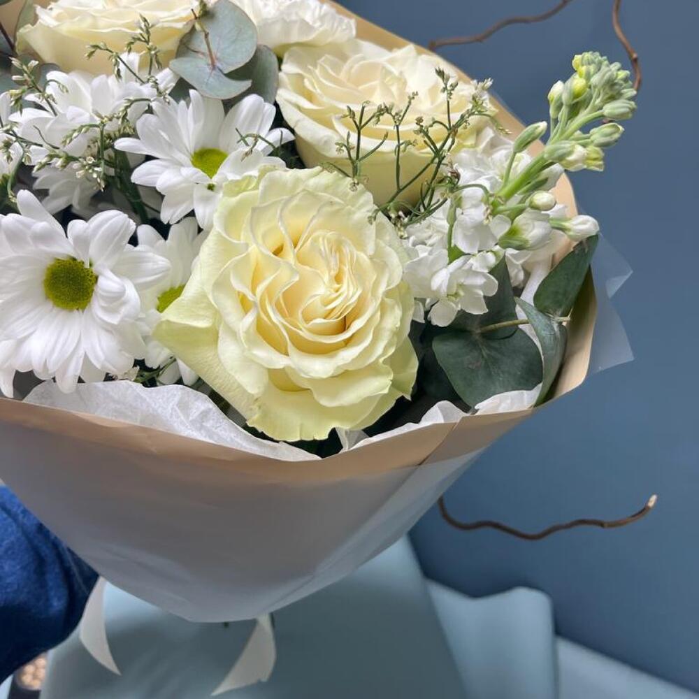 Букет с сортовыми розами,маттиолой и фрезией «Пломбир»