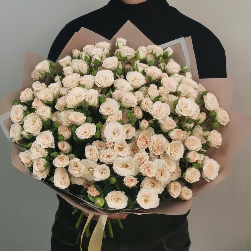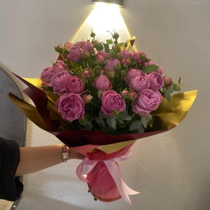 Кустовая роза пионовидная – 21 шт. Упаковка дизайнерская – 2 шт. Открыточка с вашими пожеланиями – 1 шт.