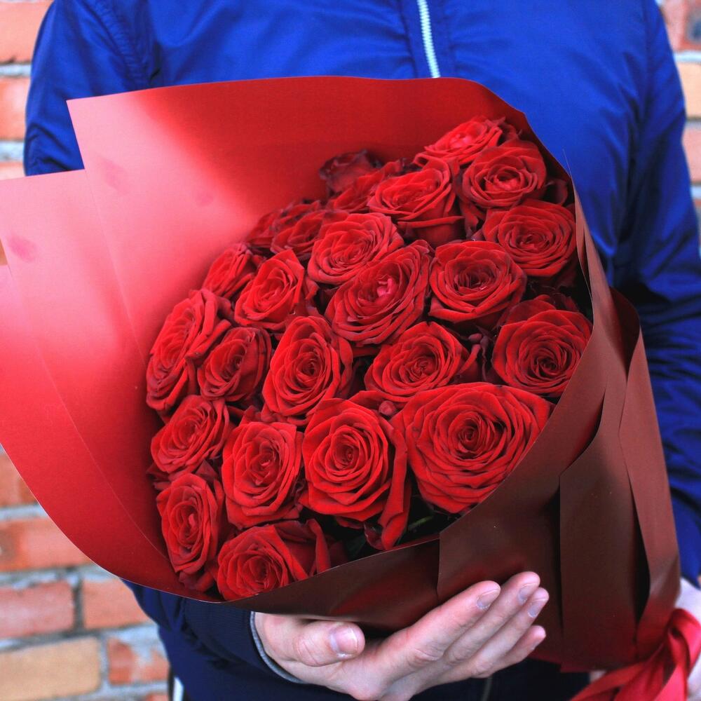 Роза красная – 25 шт.Лента атласная – 1 шт.упаковочный материал – 2 шт.