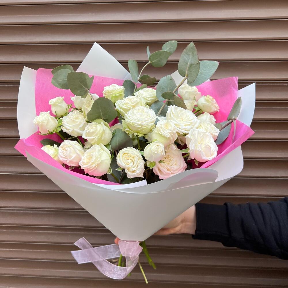 Кустовая роза Бомбастик – 5 шт.Эвкалипт – 4 шт.Тишью – 1 шт.Пленка матовая – 2 шт.Лента атласная – 1 шт.