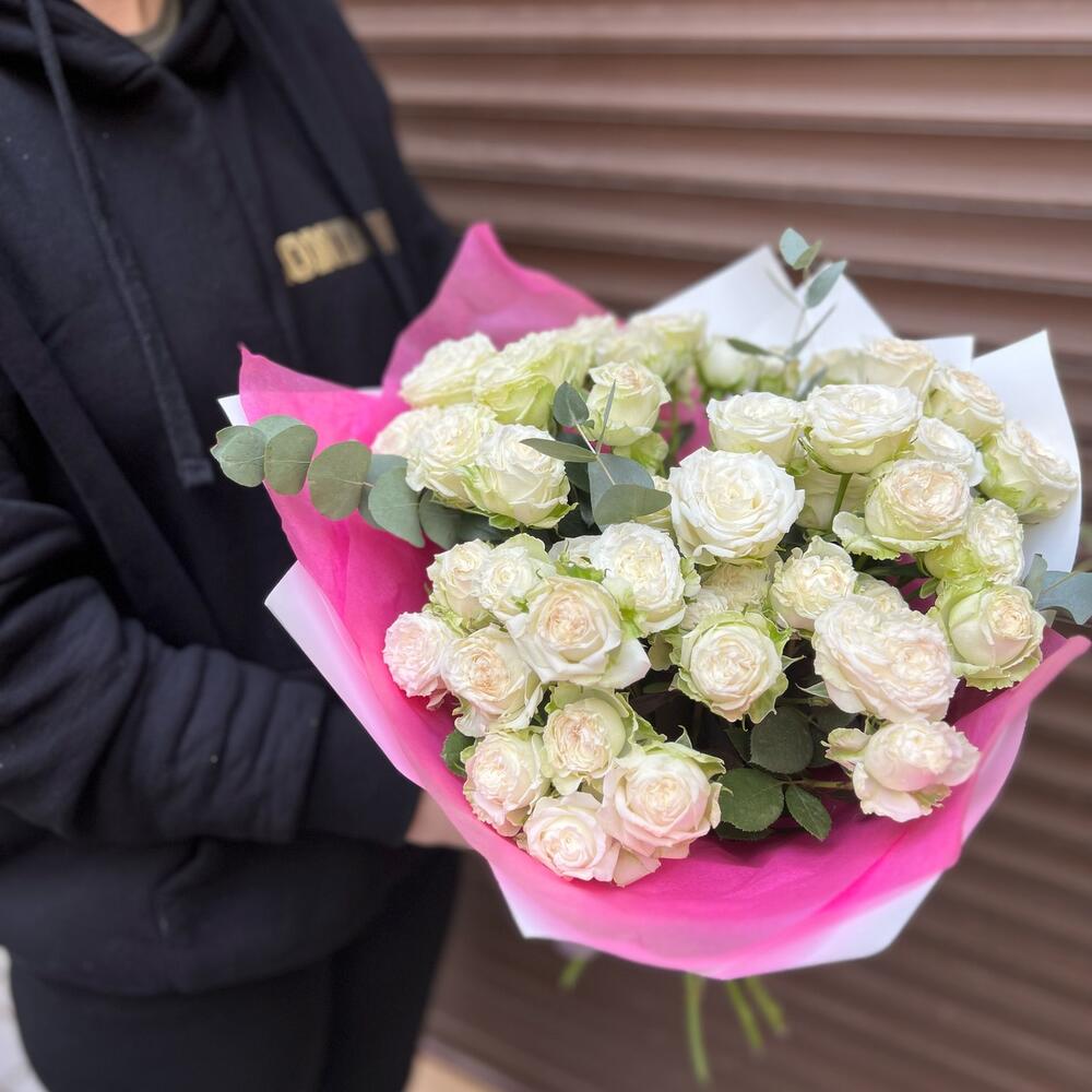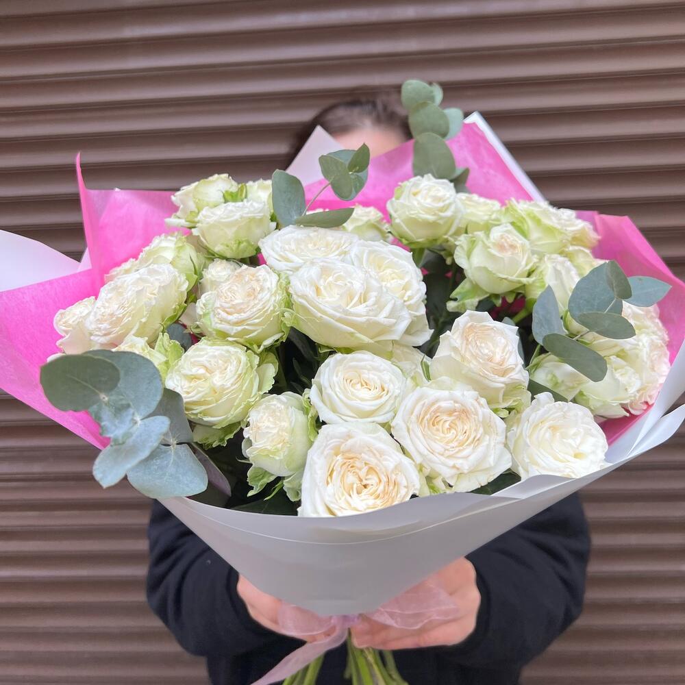 бомбастик белая – 9 шт.Эвкалипт – 5 шт.Тишью – 1 шт.Пленка матовая – 2 шт.лента атлсная – 1 шт.