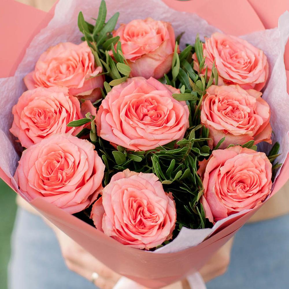 Букет из 9 кораллово-розовых пионовидных роз Wild Love с фисташкой