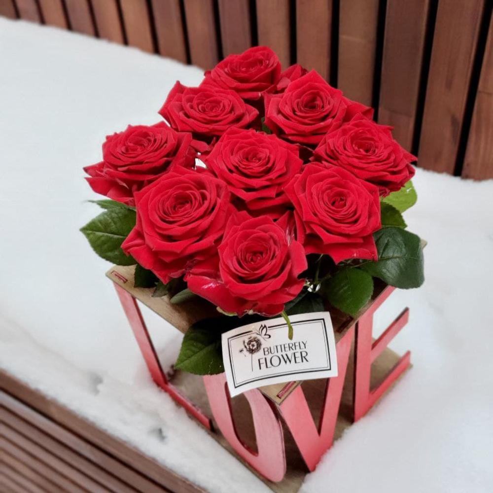 Букет из 9 роз в коробке с колбами “Love”