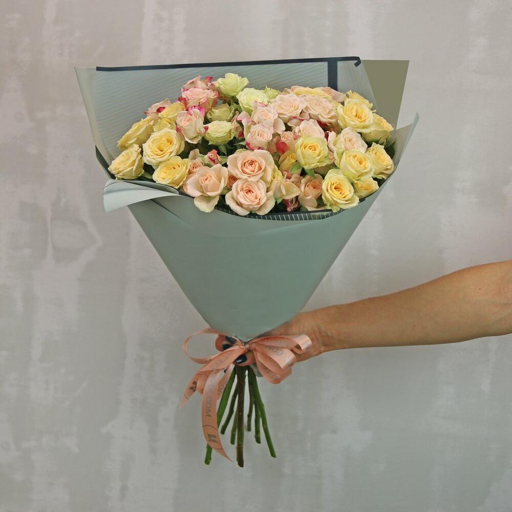 Букет из 9 высоких кустовых роз (Кения) 60-70 см нежный микс в стильной упаковке