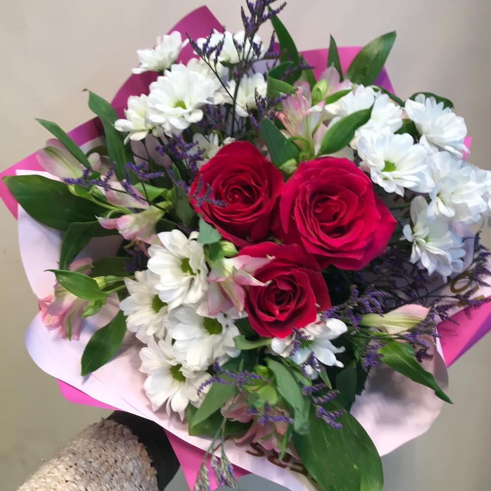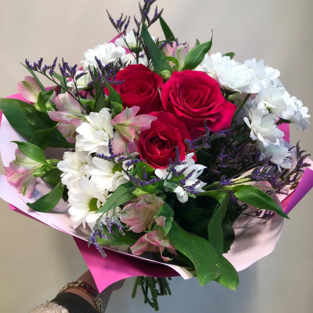 роза готча эквадор – 3 шт.Хризантема бакарди белая кустовая – 3 шт.Альстромерия – 3 шт.Лимониум сиреневый – 2 шт.Рускус сочи – 3 шт.Упаковка дизайнерская – 2 шт.